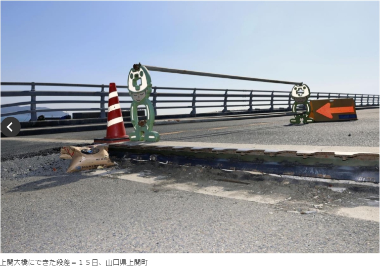 14日午後8時ごろ、山口県上関町の長島と本州側とを結ぶ唯一の陸路の上関大橋で、路面にできた段差に乗用車が衝突したと110番があった。橋は通行止めとなり、復旧の見通しは立っていない。町は対策本部を設け、住民が往来できるよう臨時の船を出している。