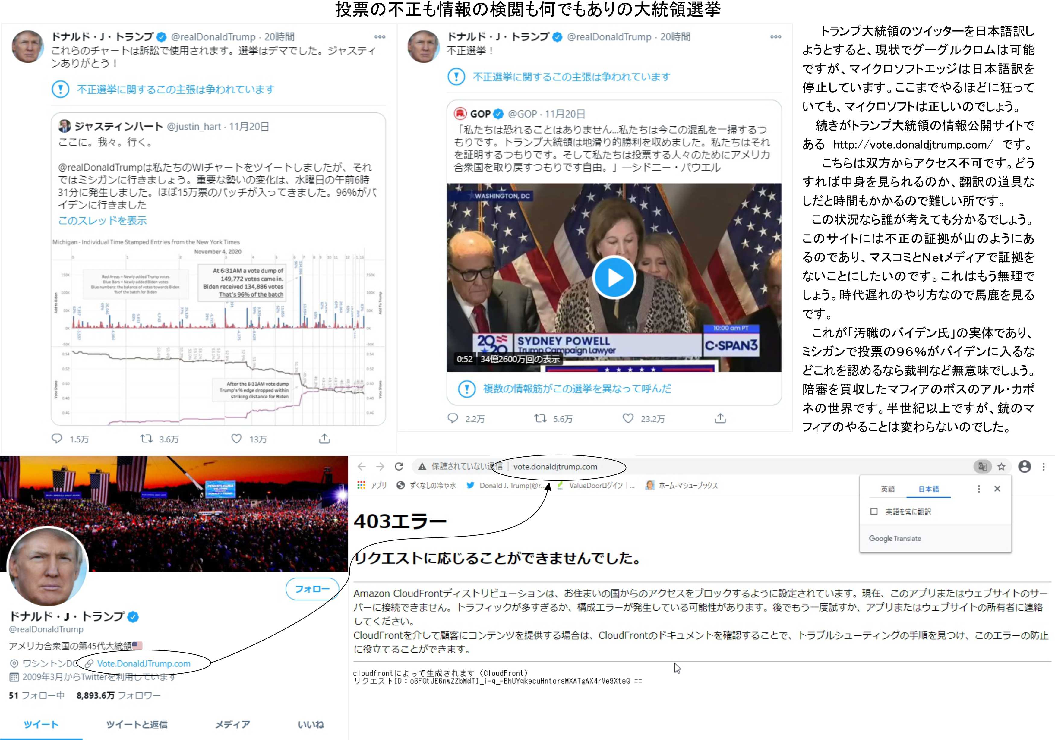 フェイクニュースはミシガンにおいてトランプ氏は負けたという報道でしょうが、現実はこれからでしょう。まずは2週間の延期を勝ち取れるか、もしくは不正の存在を現時点で明確に出来るかです。