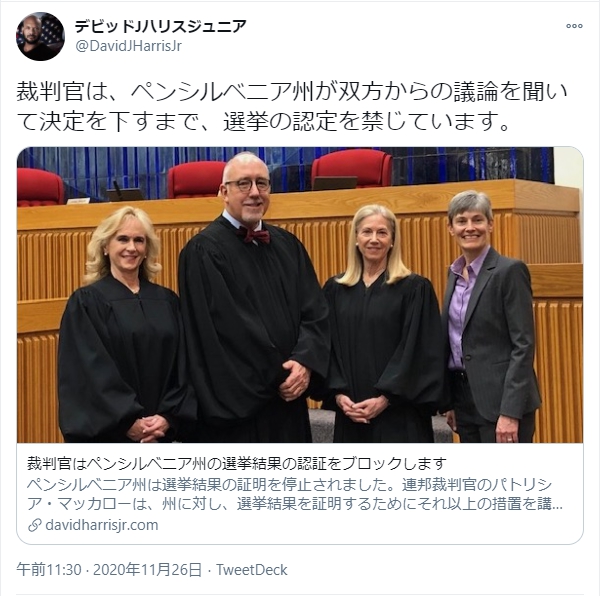 ペンシルベニア州は選挙結果の証明を停止されました。連邦裁判官のパトリシア・マッカローは、11月27日に両党の意見が聴取されるまで、選挙結果を証明するためにこれ以上の措置を講じないよう州に命じました。