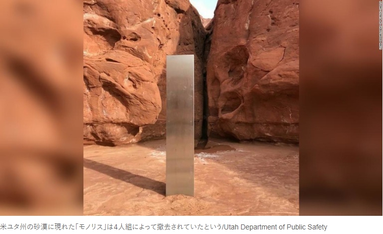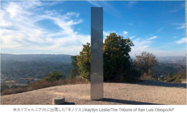 キリスト教圏に設置されるモノリスはすぐに排除されるでしょうが、日本に設置されると、普通に考えると、保存の対象でしょう。金属は地球にない元素の配合にしているでしょうから、今から調べることが楽しみになるレベルです。