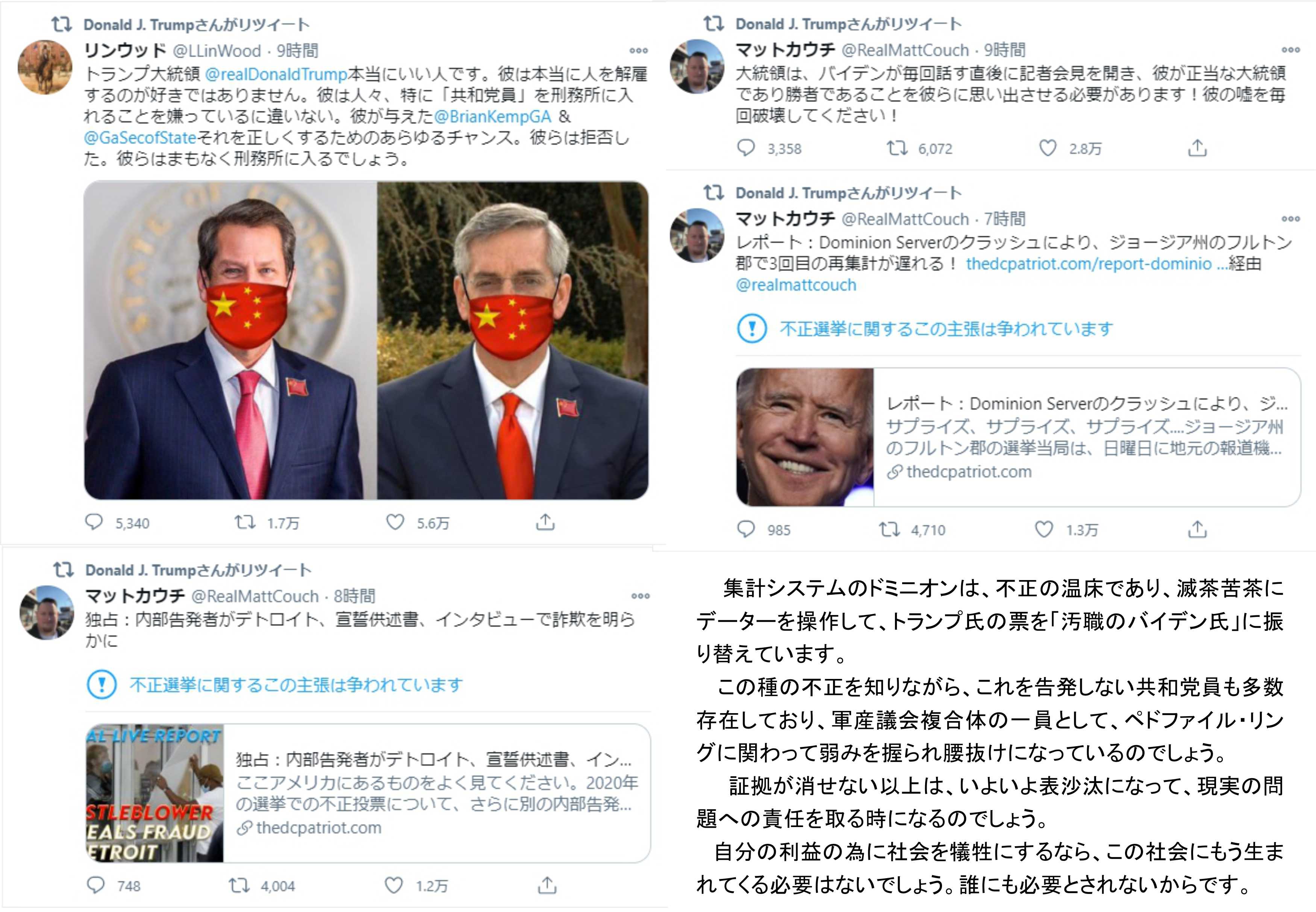 トランプ氏は大統領になる予定で行動しており、ここの再選挙の結果は大きく響きますので、最重点の対処でしょう。この先出てくる不正選挙の大量の証拠類も重要ですが、上院でこの2議席を失うのは非常に痛いので、不正選挙でしか勝てない民主党の不正を明確にして、事前に大統領選挙の不正までも明確にする事で、ここで勝ちたいでしょう。