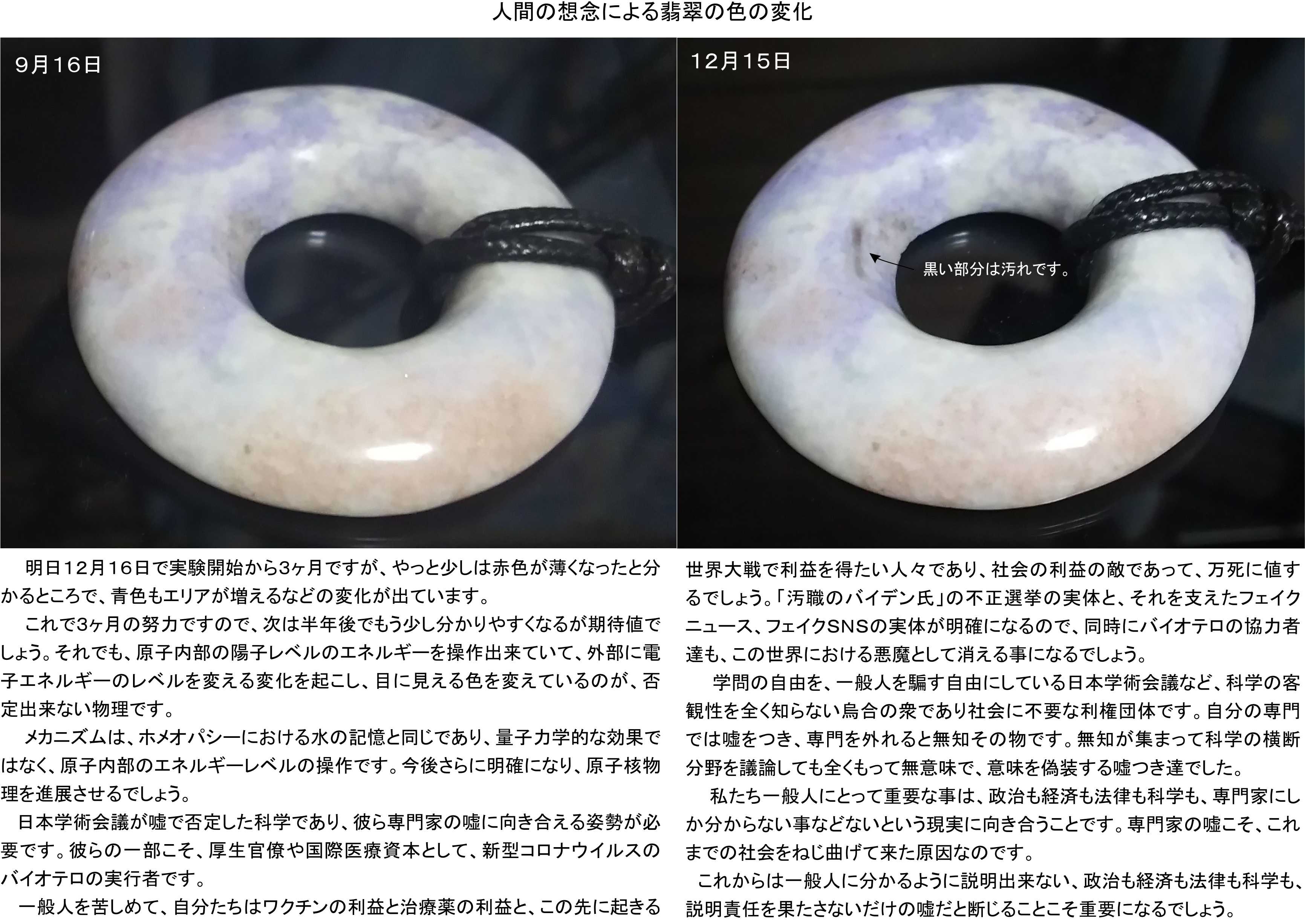 これで3ヶ月の努力ですので、次は半年後でもう少し分かりやすくなるが期待値でしょう。それでも、「らせんの力」により原子内部の陽子レベルのエネルギーを操作出来ていて、外部に電子エネルギーのレベルを変える変化を起こし、目に見える色を変えているのが、否定出来ない物理です。