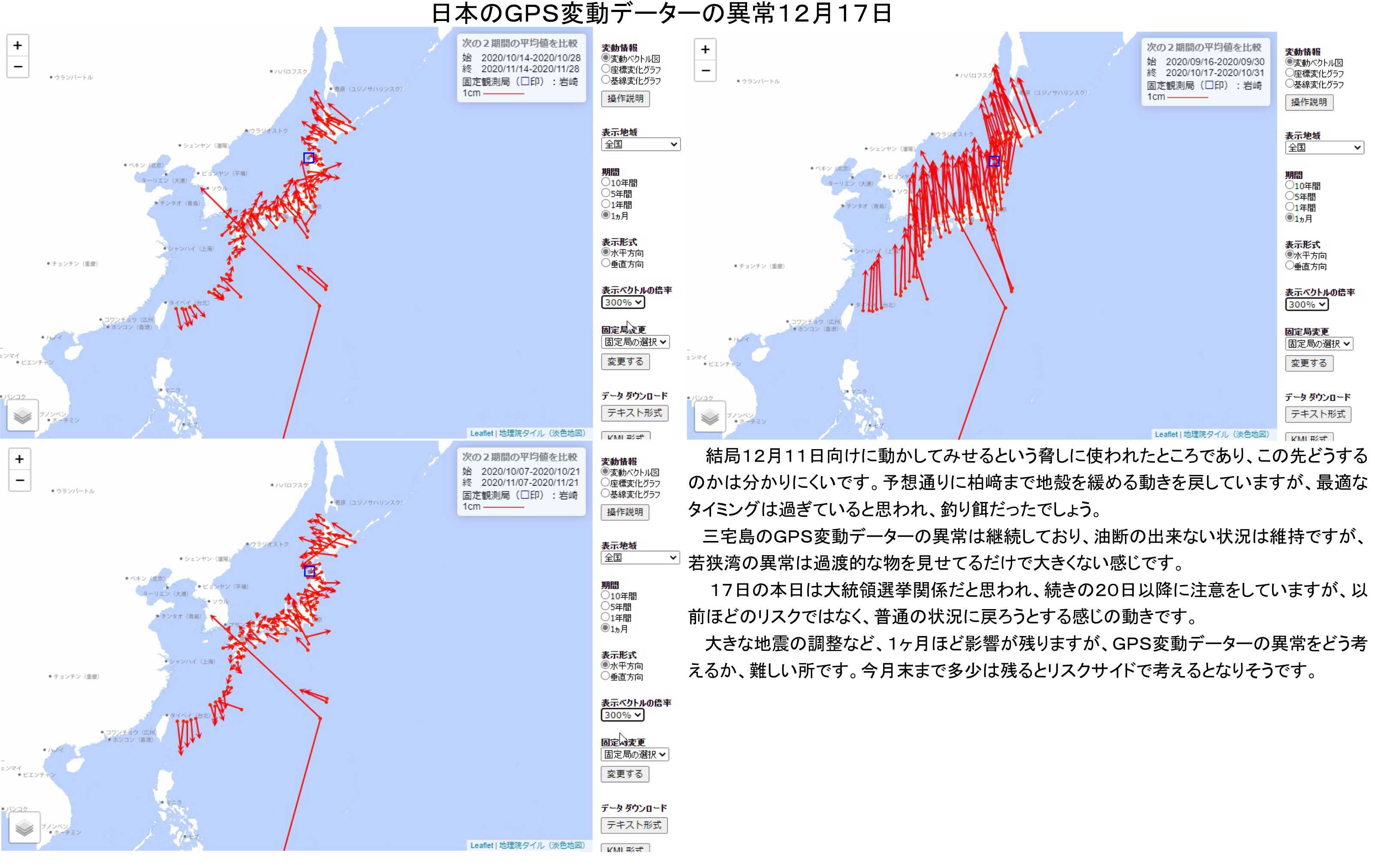 大きな地震の調整など、1ヶ月ほど影響が残りますが、GPS変動データーの異常をどう考えるか、難しい所です。今月末まで多少は残るとリスクサイドで考えるとなりそうです。
