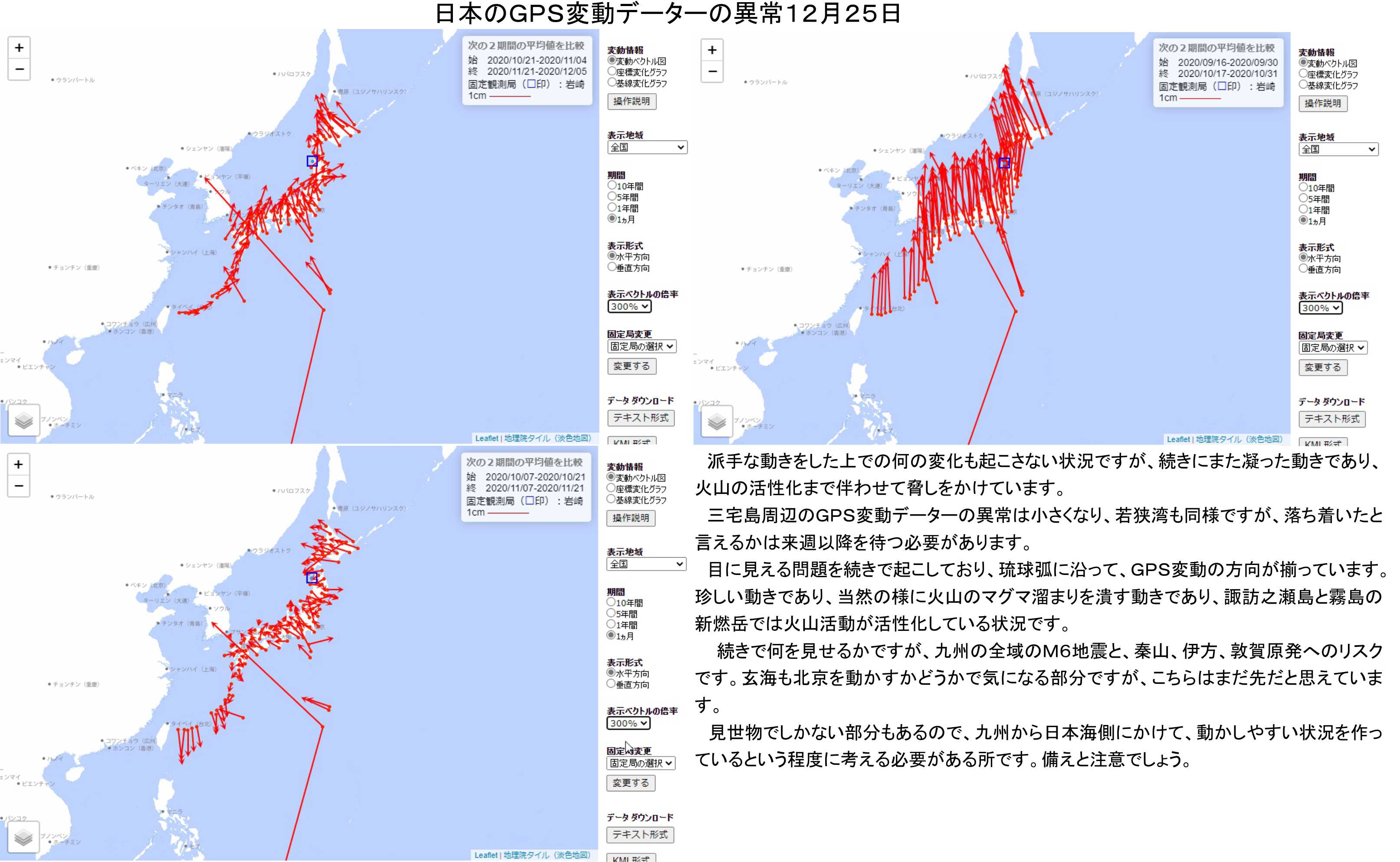 目に見える問題を続きで起こしており、琉球弧に沿って、GPS変動の方向が揃っています。珍しい動きであり、当然の様に軸方向に火山のマグマ溜まりを潰す動きであり、諏訪之瀬島と霧島の新燃岳では火山活動が活性化している状況です。