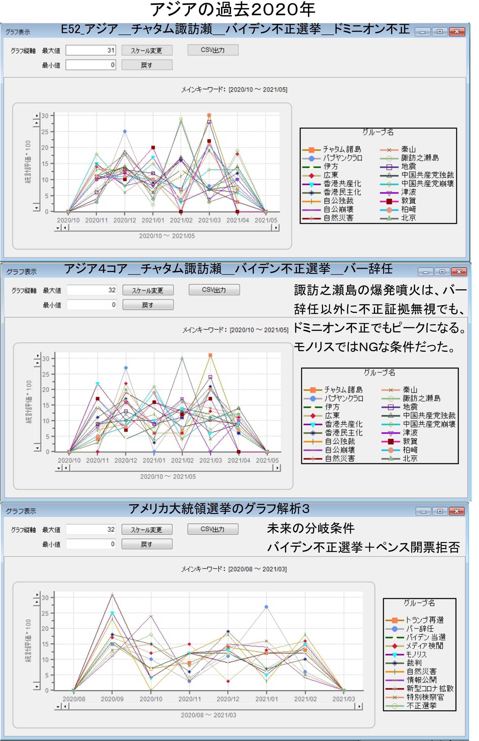 1月7日に緊急事態宣言が出されたので、日本の未来をここから調べます。ファイル名の先頭のアジアはアジアの解析、4コアは使ったPCの仮名、コロナテロは解析内容で、続きの緊急事態と不正証拠無視が未来の分岐条件です。緊急事態宣言下において、米国大統領選挙における不正の証拠が無視されているという現状の解析結果です。