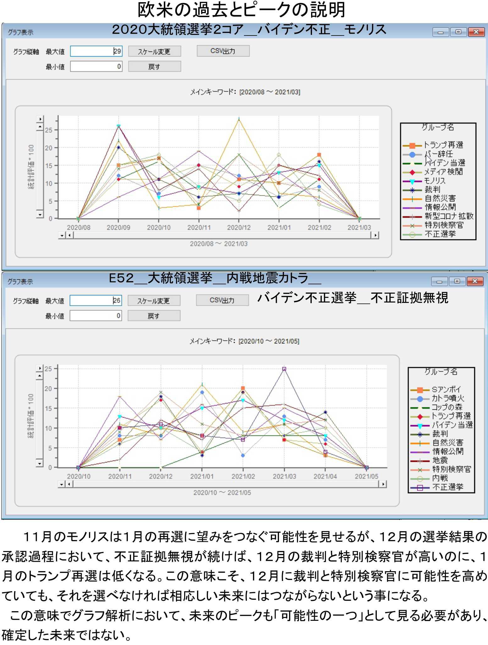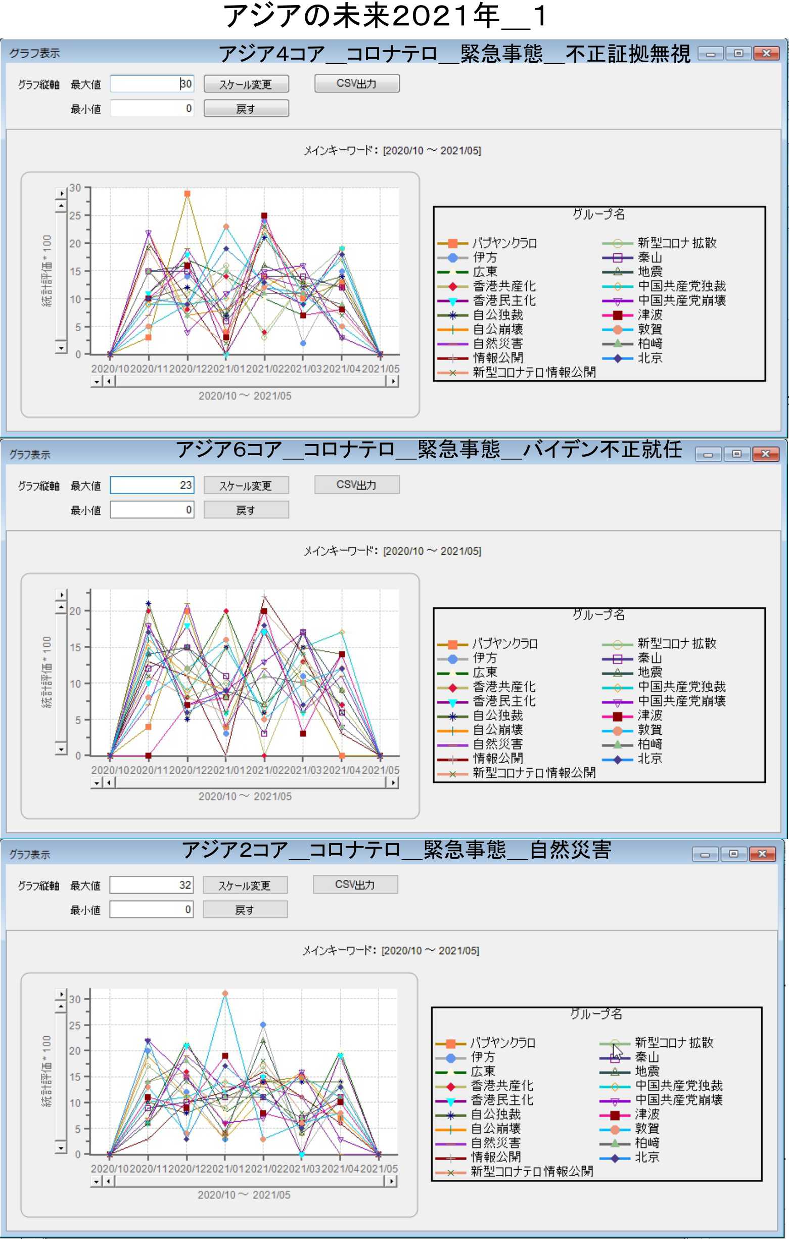 各国の未来の流れの重なりで、決まってくる未来を調べる組み合わせを考えています。ここに2020年や2021年と1~12月を組み合わせて、そこに組み込まれている情報を解析してグラフを描いています。