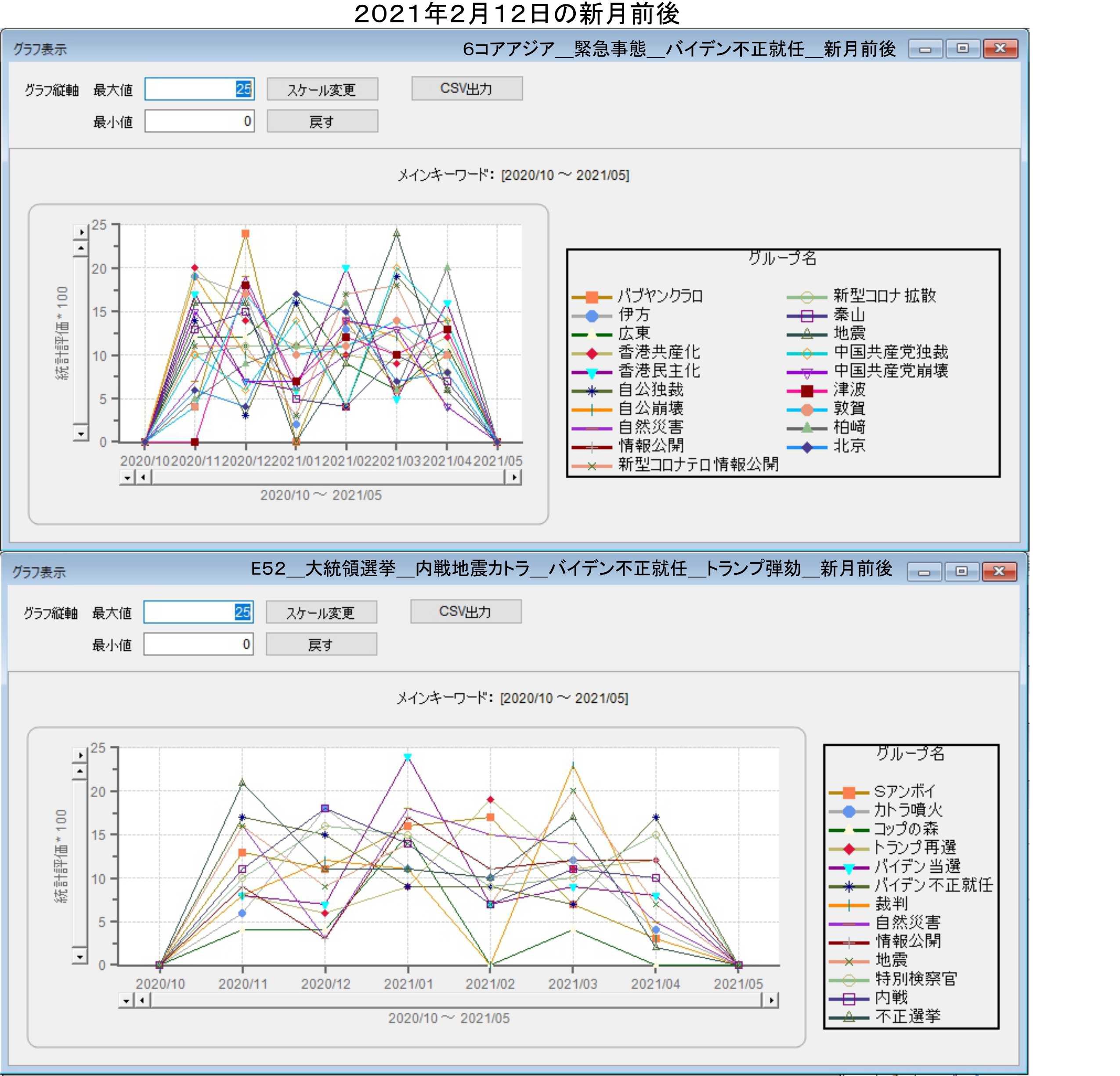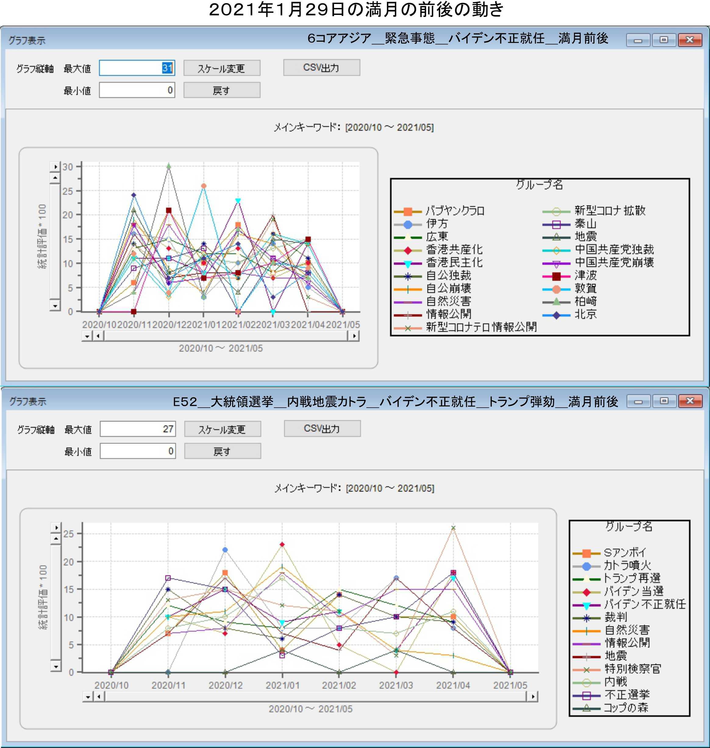 アジアのデーターで、現状に対して満月前後を追加して評価しました。現状は緊急事態+バイデン不正就任が未来を決める条件ですが、今月末の満月もここに条件として加えて、評価を行いました。イラスト参照下さい。