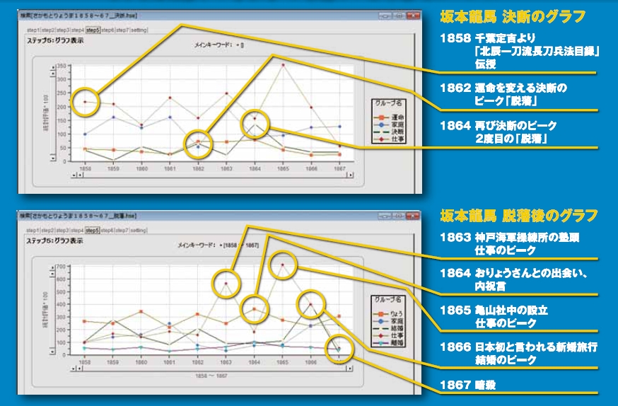 上のグラフには龍馬の2度の脱藩に伴う決断が出ています。脱藩に伴う大きな仕事が2つのピークとして下のグラフに出ています。