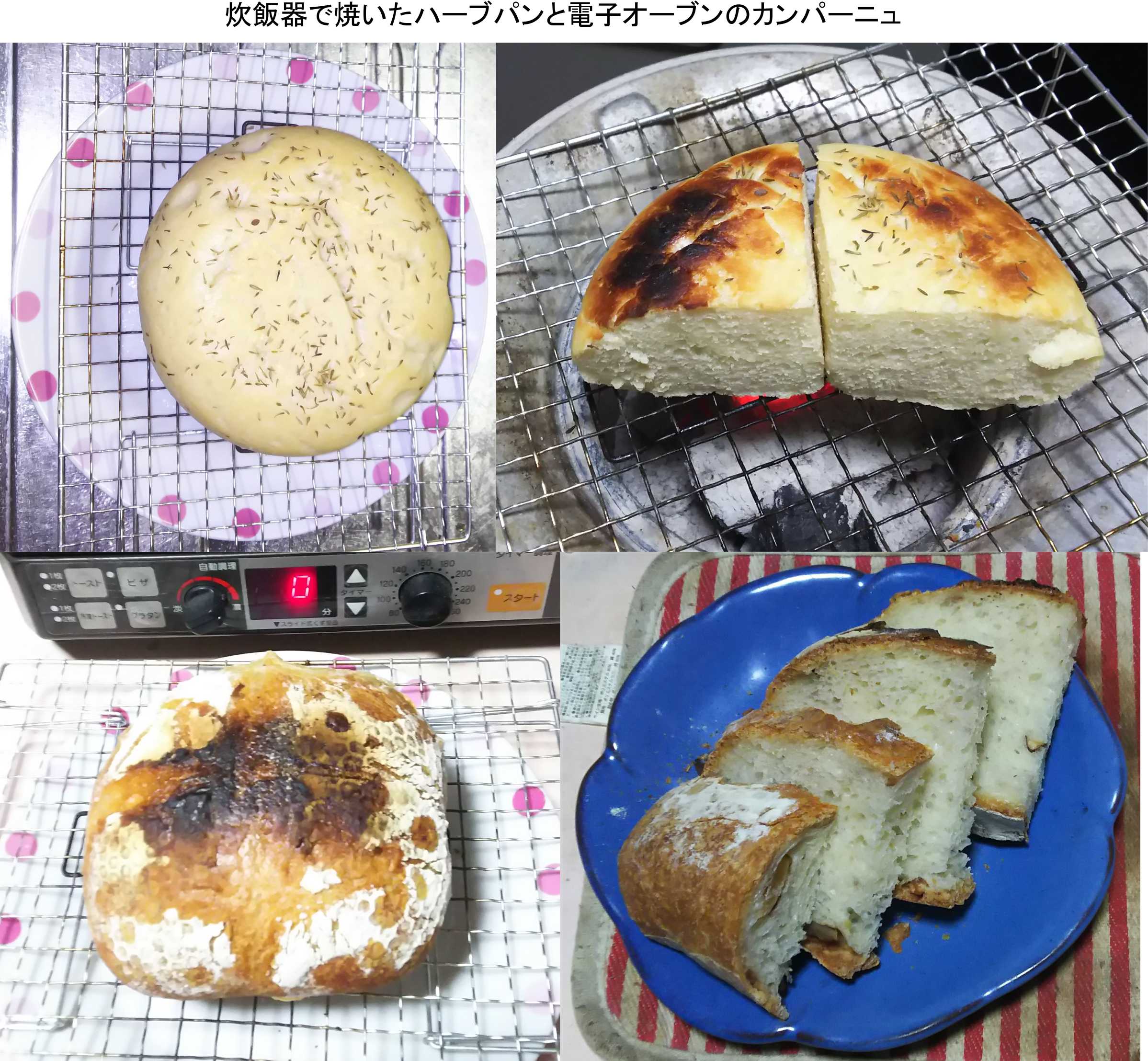 イラストにはハーブパンとカンパーニュというフランスパンの丸い物を載せています。炊飯器でもパンが焼けて、トースター用の電子オーブンでもパンが焼けました。