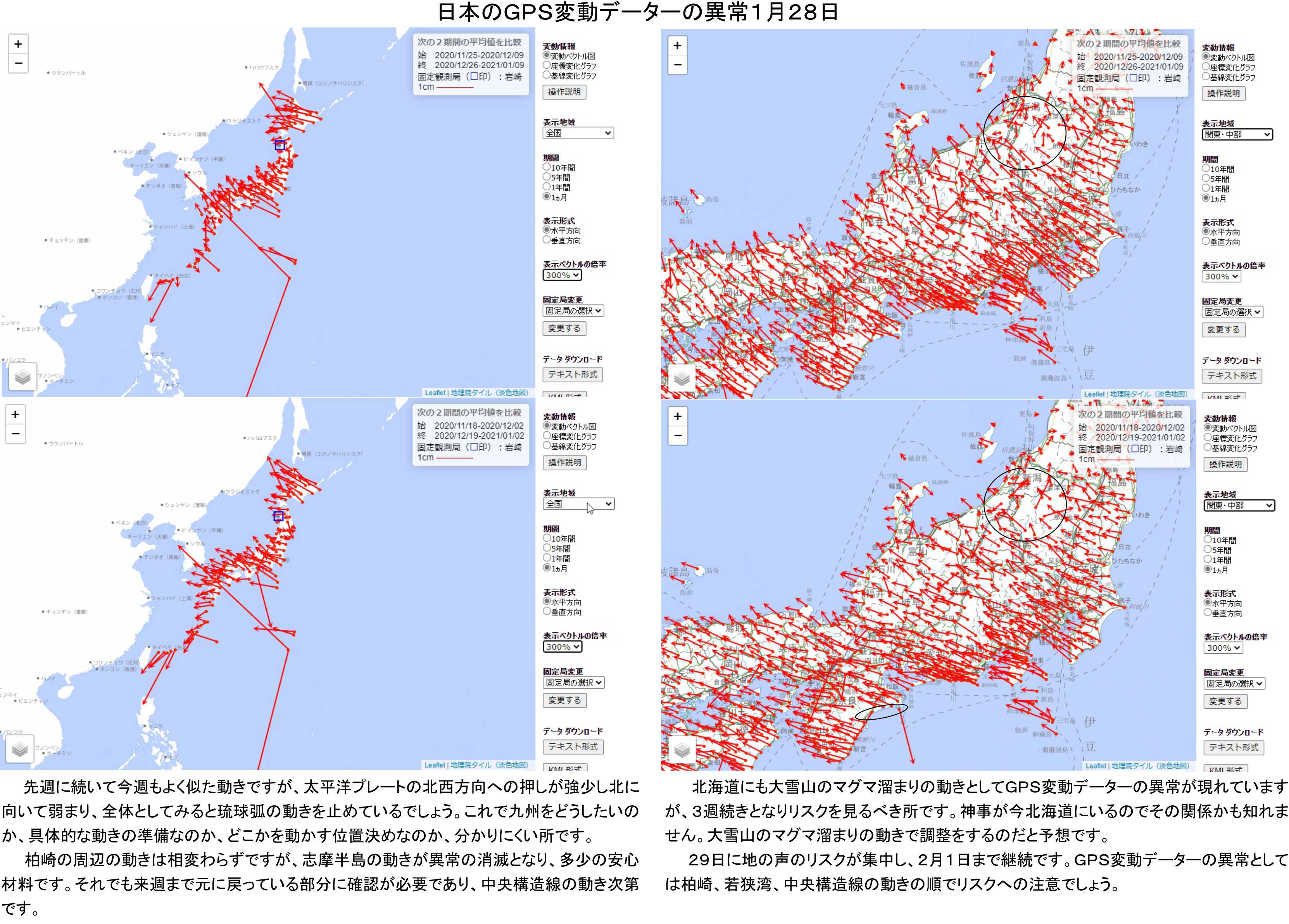 北海道にも大雪山のマグマ溜まりの動きとしてGPS変動データーの異常が現れていますが、3週続きとなりリスクを見るべき所です。神事が今北海道にいるのでその関係かも知れません。大雪山のマグマ溜まりの動きで調整をするのだと予想です。