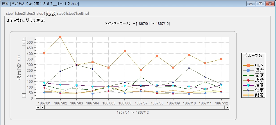 龍馬さんの場合、ただ選んだだけではありません。脱藩によって大きく運命が変わっていると思われたので、その言葉を強調して含む部分を抜き出してグラフにしています。8月14日の下側のグラフで、彼の仕事をきれいに再現しています。