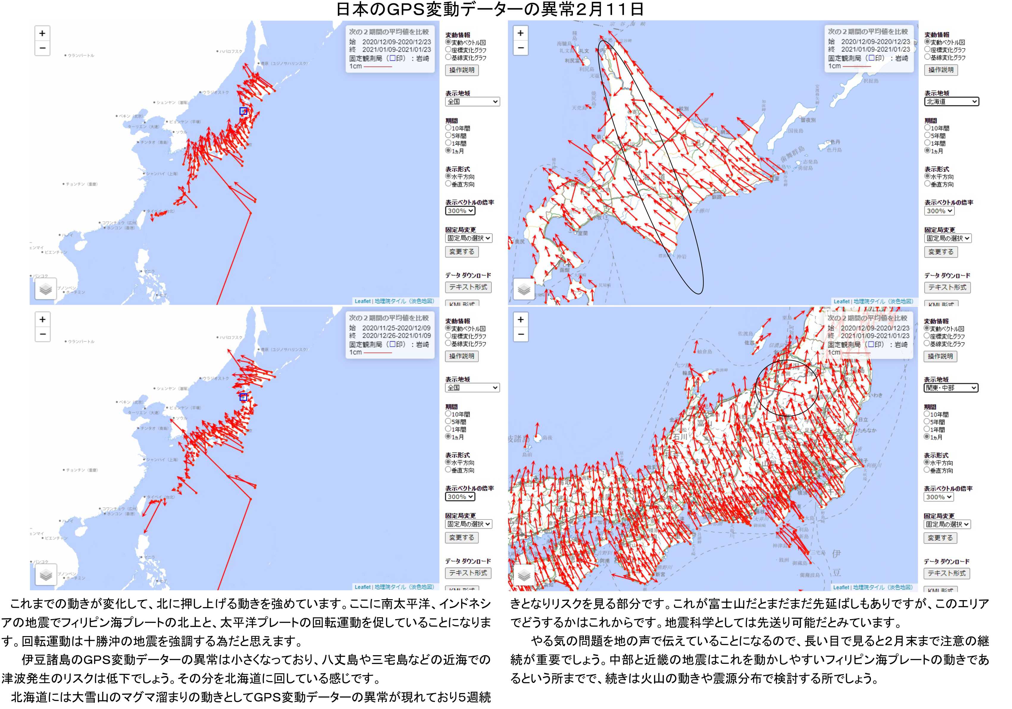 北海道には大雪山のマグマ溜まりの動きとしてGPS変動データーの異常が現れており5週続きとなりリスクを見る部分です。これが富士山だとまだまだ先延ばしもありですが、このエリアでどうするかはこれからです。地震科学としては先送り可能だとみています。