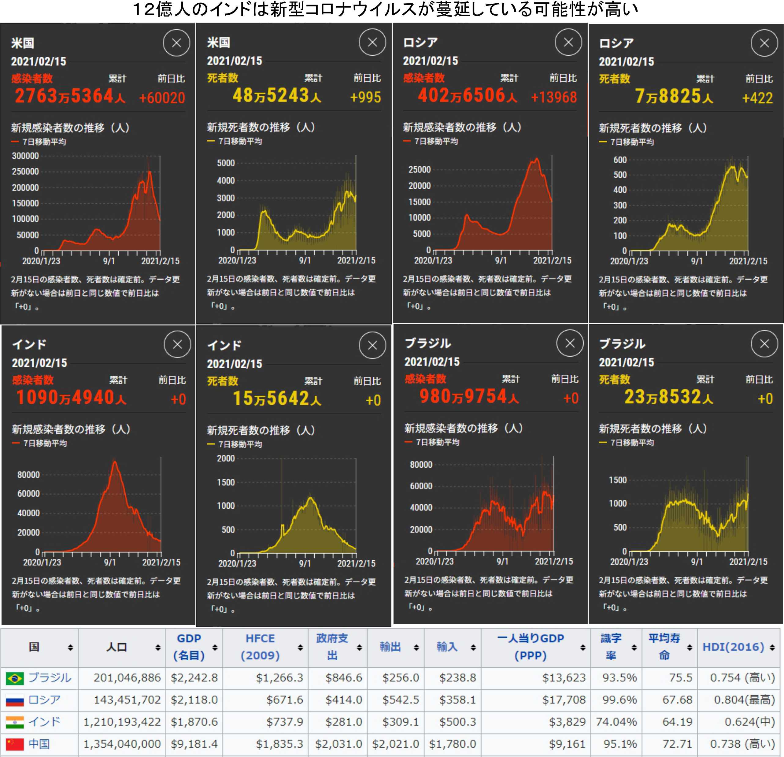 インドではその貧しさ故だと思われますが、昨年の夏まででマスクの着用が上手く進まなかったので、空気感染する新型コロナウイルスは既に蔓延状態に近い進展だったのではないかと思われます。その結果で他国で言う第三波くらいの10月以降の流行が、ほとんど影響なしでの進展でした。既に蔓延しているので、今更流行らないという状況に見えるのです。