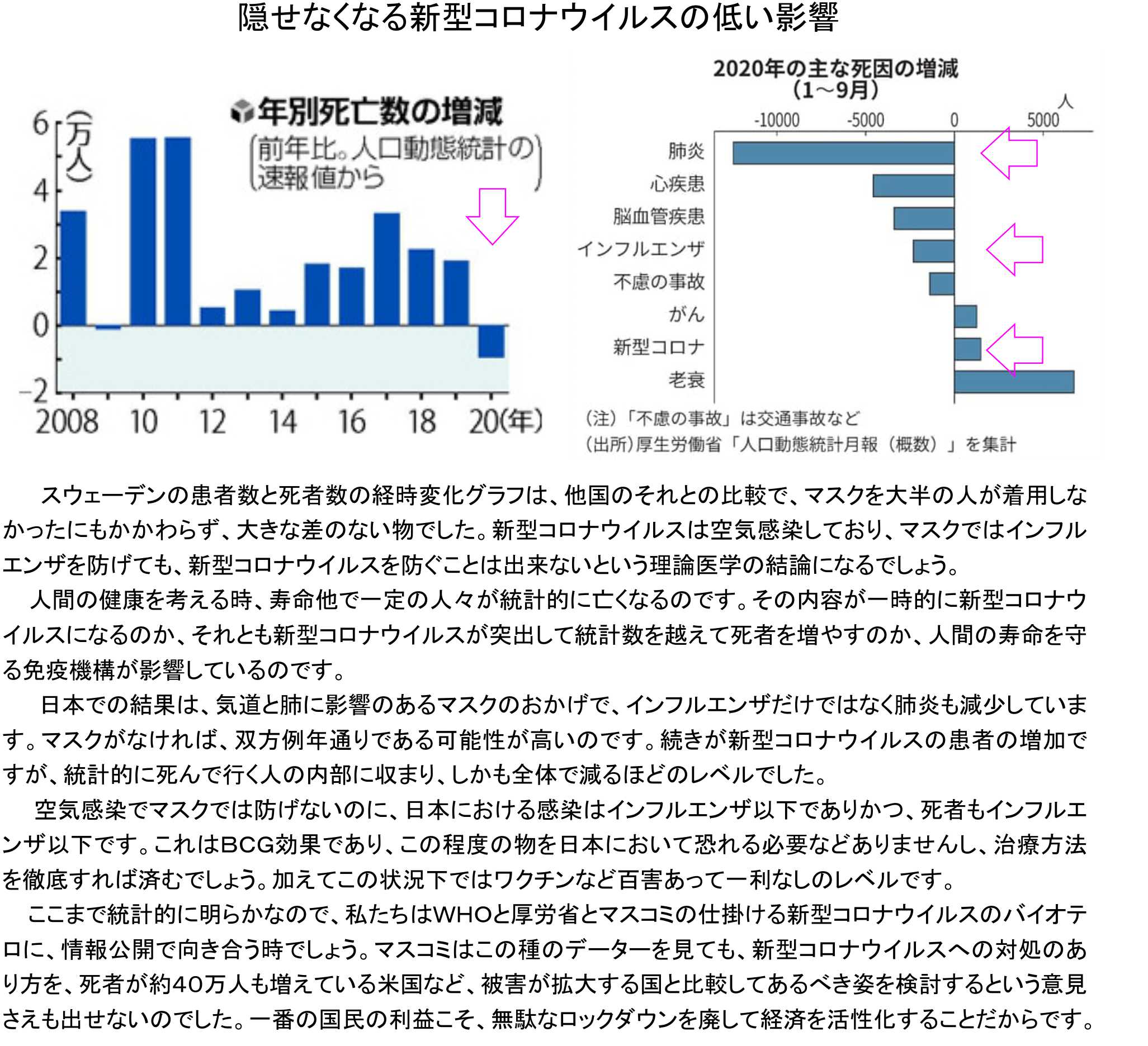 日本での結果は、気道と肺に影響のあるマスクのおかげで、インフルエンザだけではなく肺炎も減少しています。マスクがなければ、双方例年通りである可能性が高いのです。続きが新型コロナウイルスの患者の増加ですが、統計的に死んで行く人の内部に収まり、しかも全体で減るほどのレベルでした。