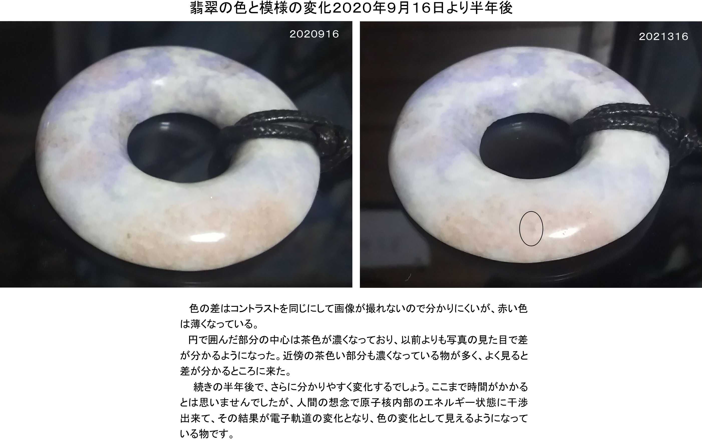 分かりやすいのはまだ一カ所ですが、これからこれらが増えるでしょう。模様のパターンも変化していることになるので、翡翠が人間の想念の影響を受けて、色と模様を変えていると言える所に進みました。らせんの力の存在と、想念がらせんの力として、翡翠の内部の原子核に作用して電子軌道を変えており、その結果で色や模様が変化すると明確に出来たでしょう。まだ間接的な証拠ですが、次の半年後にはさらに変化が分かりやすく出来るでしょう。