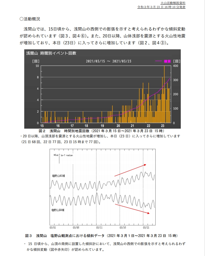 浅間山では、3月15日頃からわずかな傾斜変動が認められており、一昨日(20日)からは山体浅部を震源とする火山性地震が増加しています。また、本日(22日)実施した火山ガス観測では、火山ガス(二酸化硫黄)の放出量は1日あたり800トンと前回(2月25日、200トン)に比べ、増加しています。
