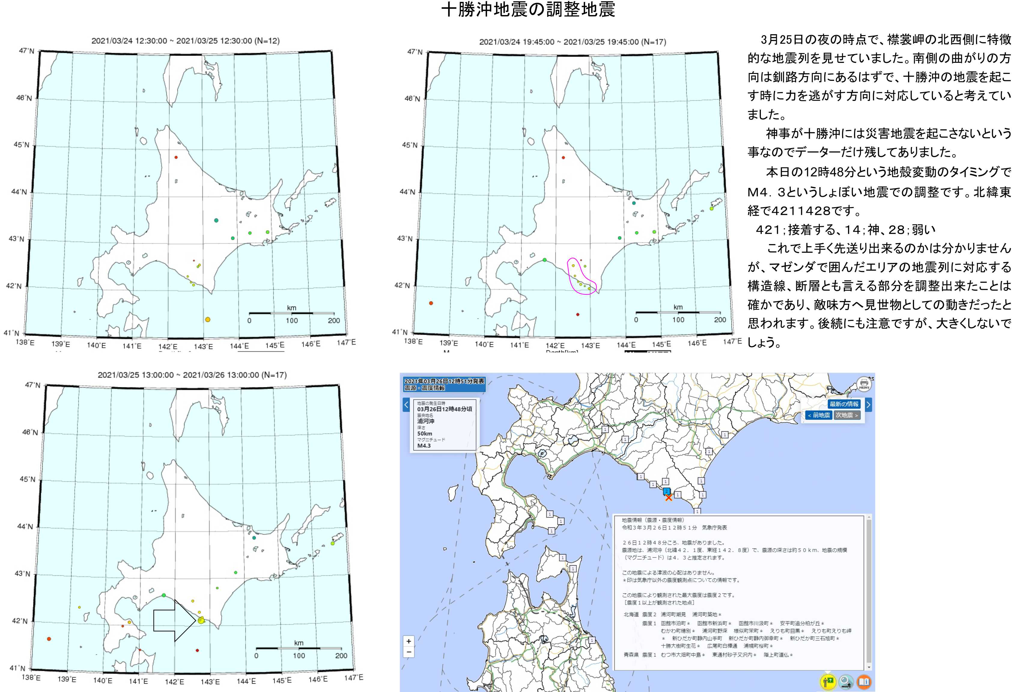 3月25日の夜の時点で、襟裳岬の北西側に特徴的な地震列を見せていました。南側の曲がりの方向は釧路方向にあるはずで、十勝沖の地震を起こす時に力を逃がす方向に対応していると考えていました。