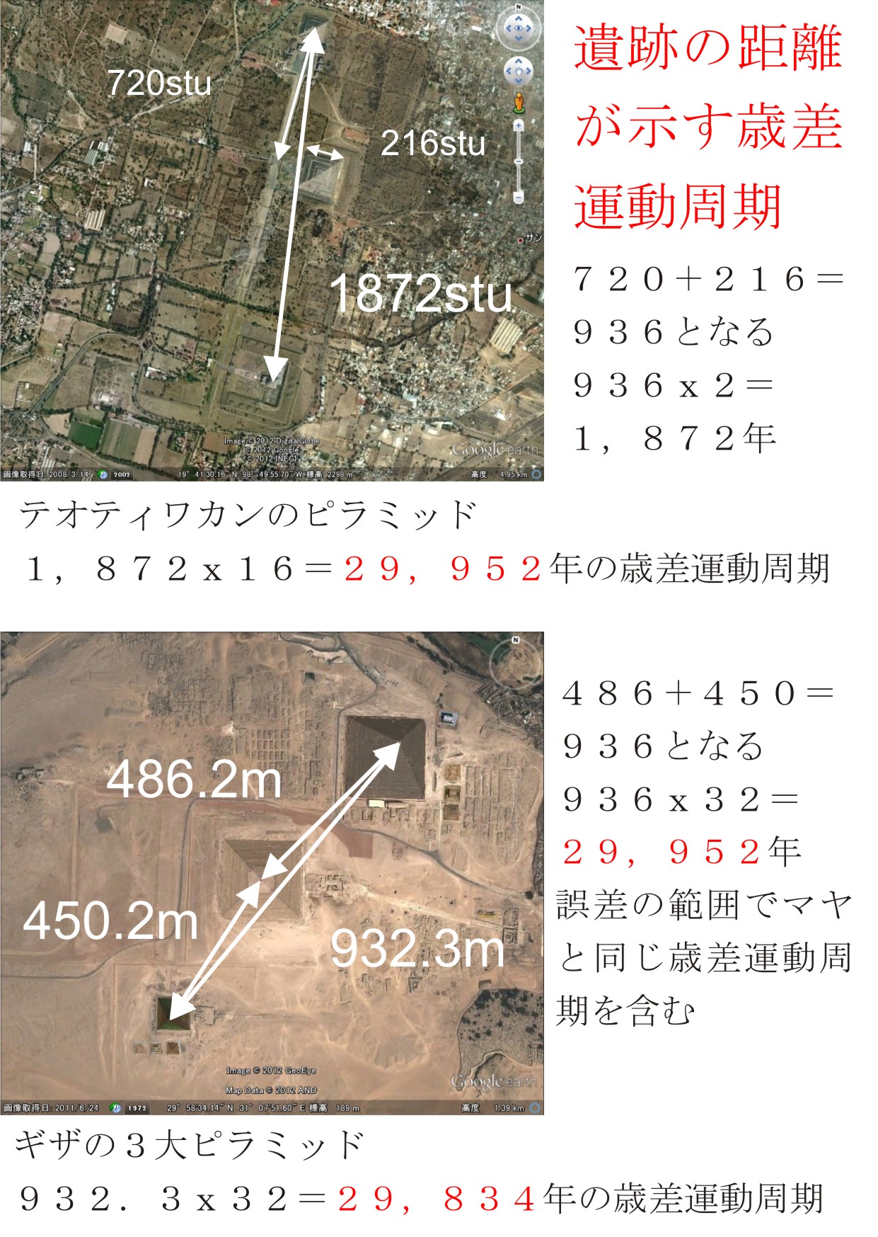 一方のギザには、伴星の本に書いたようにメートルで表す距離が直接使えます。すると下の絵に表す2つのピラミッドの距離の和がほぼ936mになります。その結果