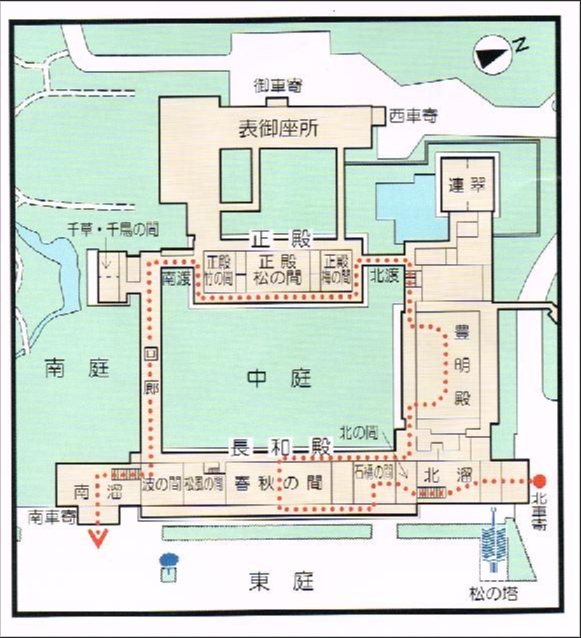 車寄に続くホールで,休所にも使用されます。北溜は拝謁にも使用され,記帳所があります。