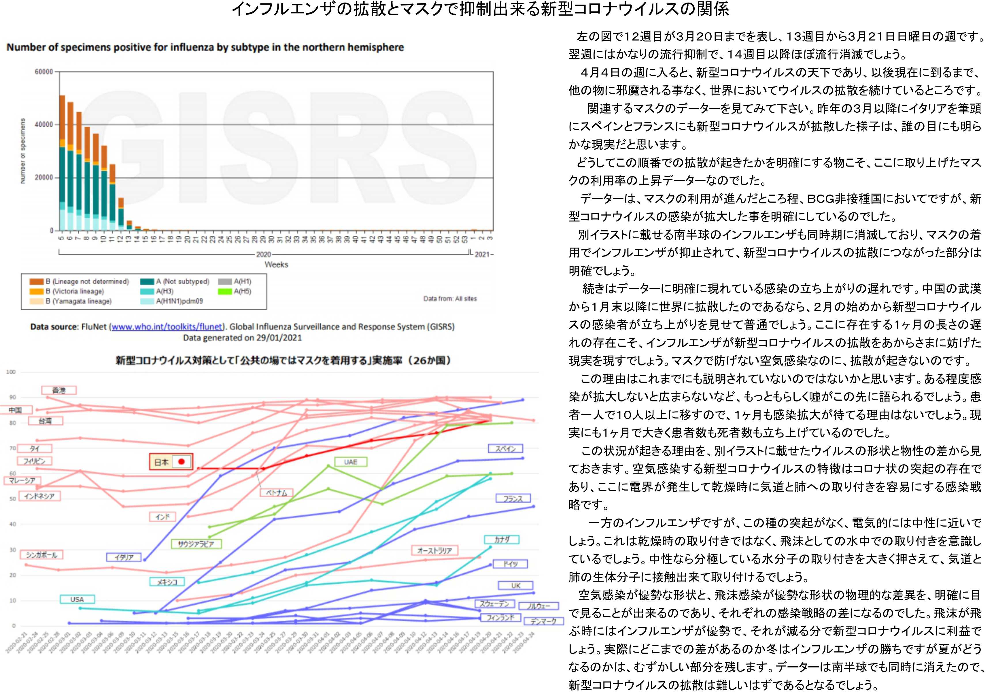 1)3~4ヶ月で感染を世界に蔓延する能力のある新型コロナウイルスが、約2ヶ月立ち上がりを遅らせた理由は、インフルエンザの流行中にそれを大きく阻止されて社会に割り込んで行く能力のないことを示す。2020年3月以降のマスクの着用こそ、飛沫感染のインフルエンザの拡散を不利にして、新型コロナウイルスの拡散を大きく助けた。
