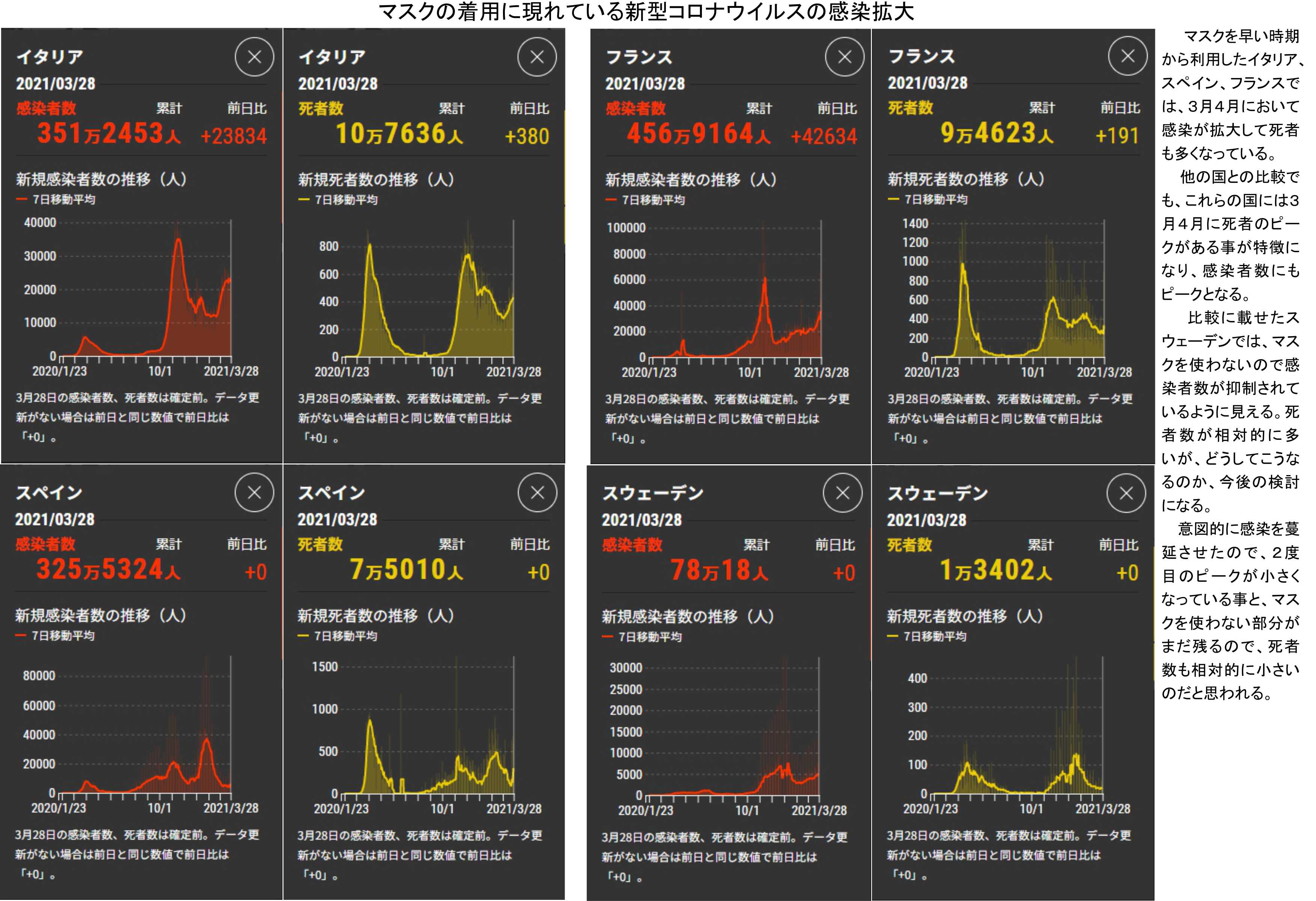 統計的に大きく新型コロナウイルスの拡散が始まり、死者が増大したのは2020年の3月中旬以降です。この時期はインフルエンザの流行が終わりの時期を迎えている部分と、人々が新型コロナを恐れてマスクを付け始めた時期です。