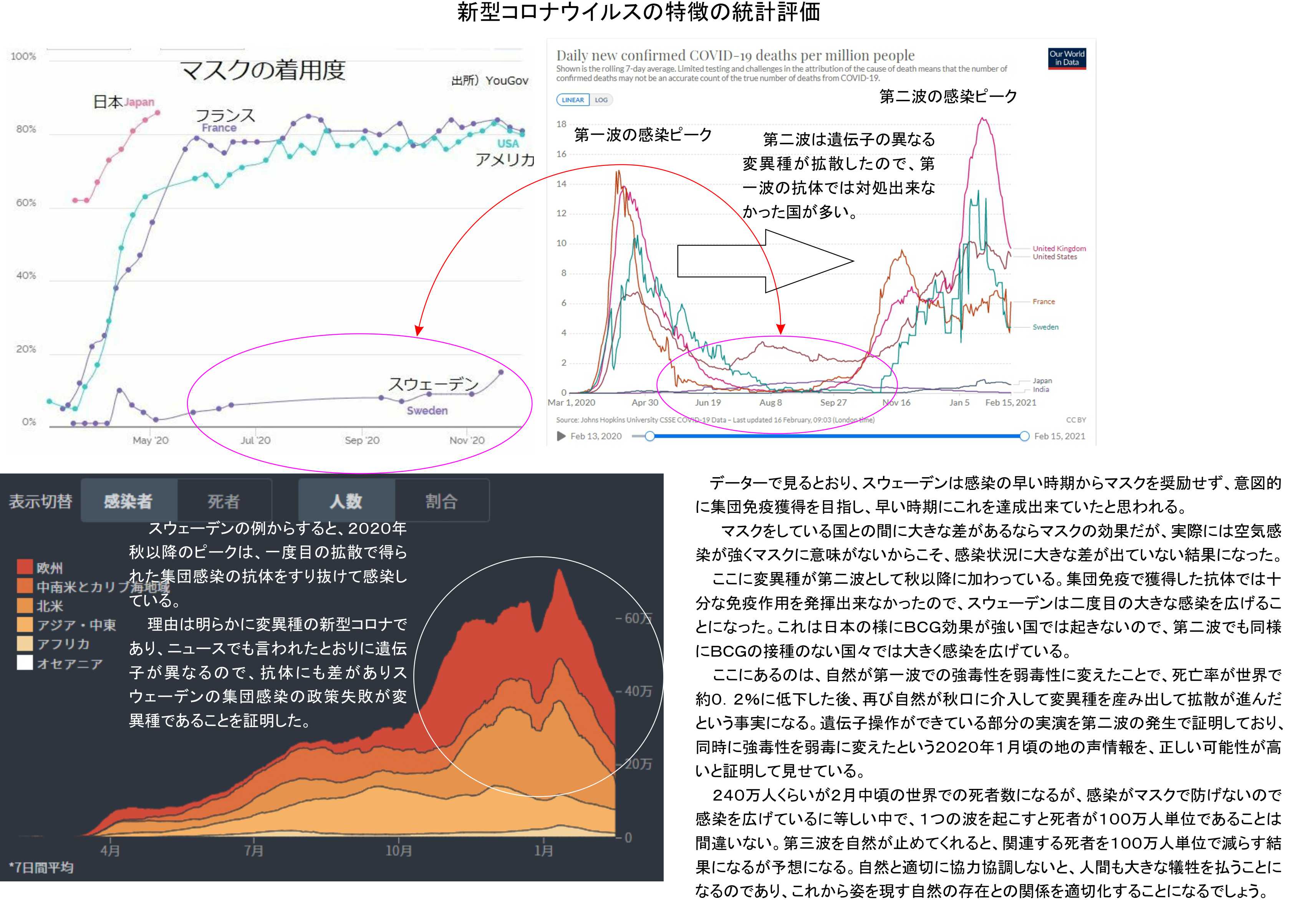 自然は現在、人間が環境破壊と地球温暖化の問題に向き合うことと、原発や5Gなど、自然が共存出来ない物を人間が自主的に止めることを願っている。これらを実現すれば、少なくともその方向に進む事が出来れば、続きの新型コロナウイルスの第三波を起こさないと伝えている。自然の存在と人霊の存在が明らかになる時に、この協力協調が意味を持つ。現在のワクチンはほとんど役に立たない物であって、欠点を隠すし、インフルエンザワクチンとの比較さえも全く行われることなく、科学的根拠に非常に乏しいのであって信じる者は騙されるの世界になっている。