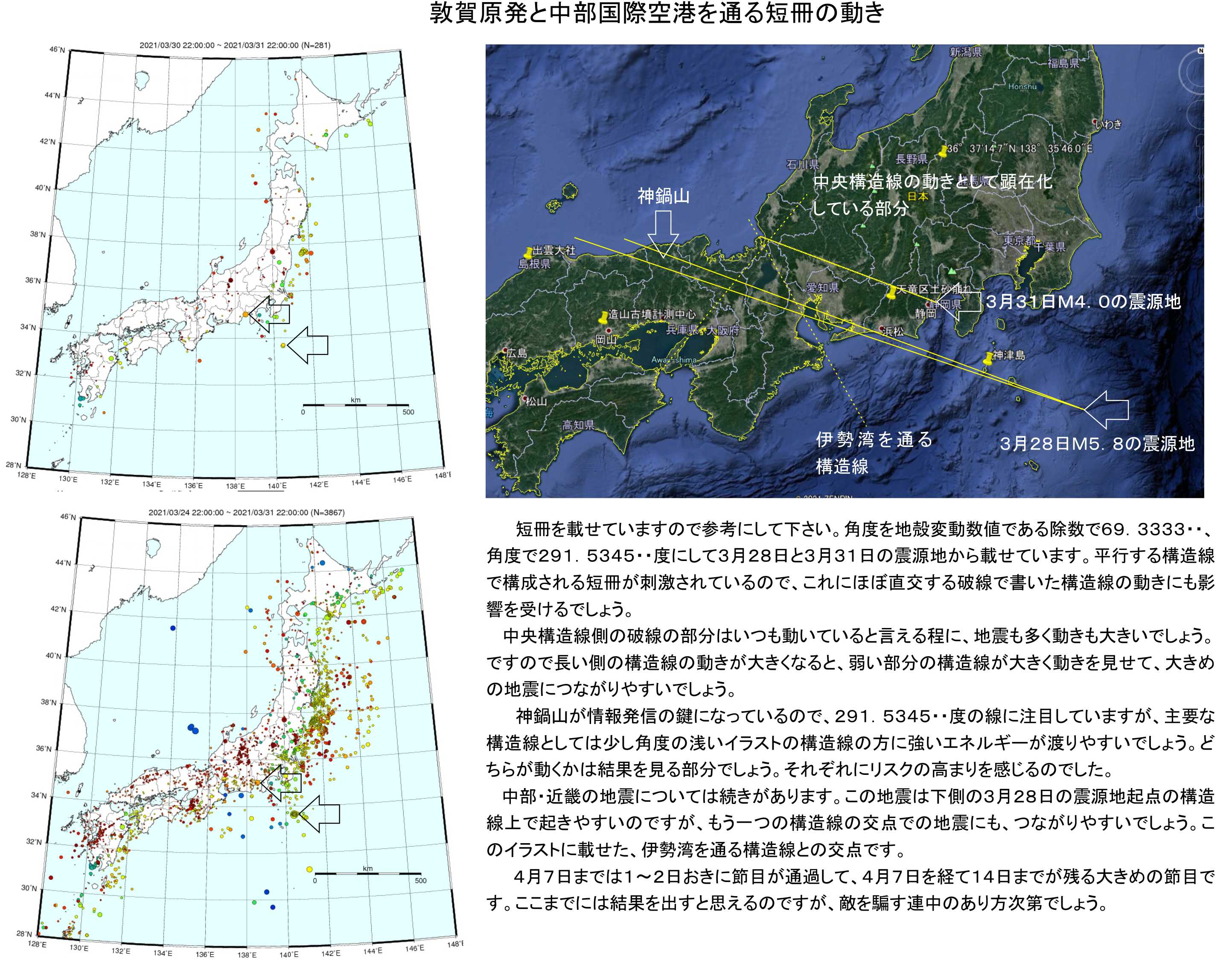 中部・近畿の地震については続きがあります。この地震は下側の3月28日の震源地起点の構造線上で起きやすいのですが、もう一つの構造線の交点での地震にも、つながりやすいでしょう。イラストに載せた、伊勢湾を通る構造線との交点です。