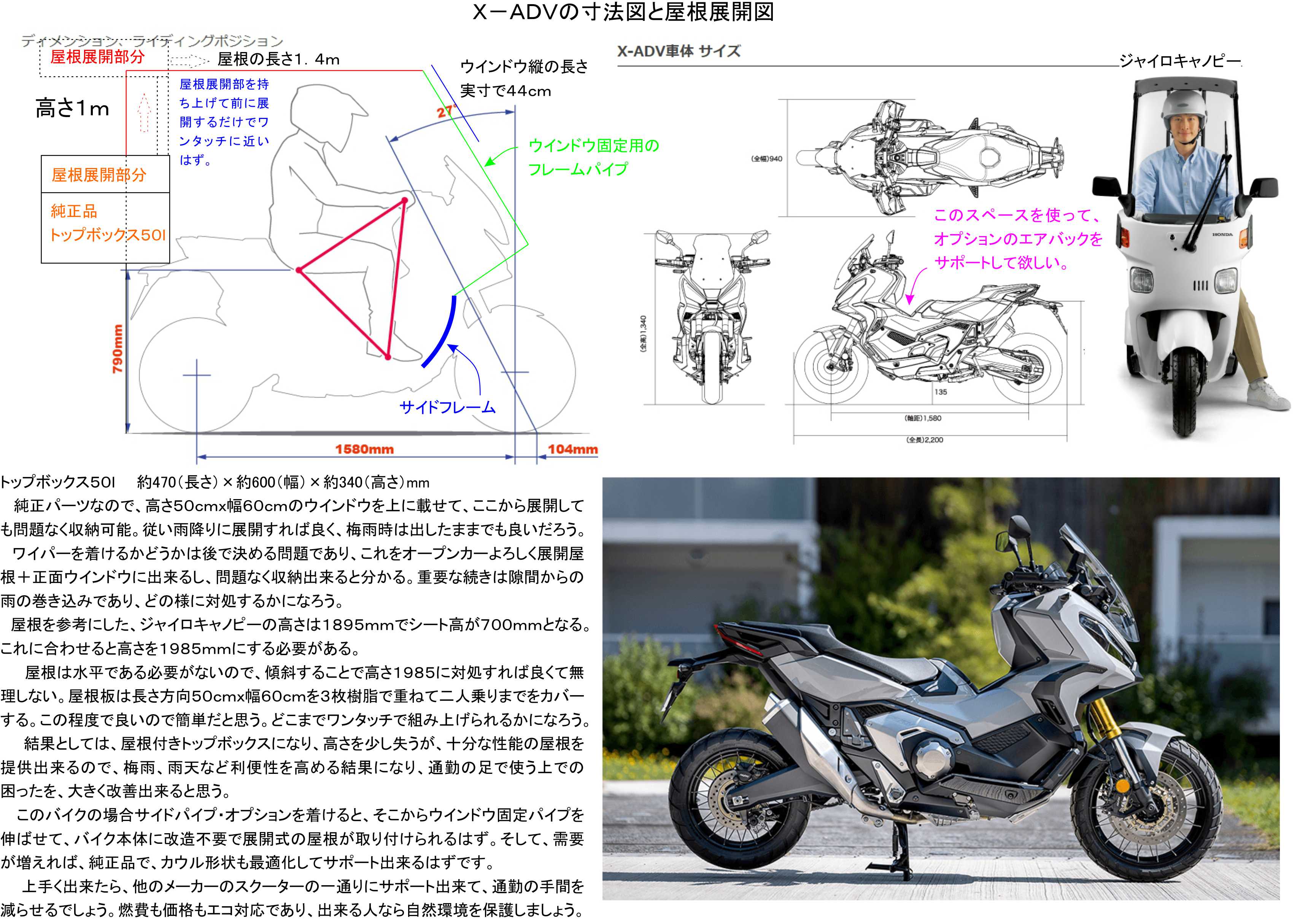 バイクを通勤で乗ることを実演するとなると、やはり雨は強敵でしょう。ギャイロキャノピーというバイクはピザ屋さんの配達でよく見かける程なので、屋根にはそれなりに大きな効果があると思っています。これを車のオープンカーよろしく折りたたみの屋根にしたいだけです。
