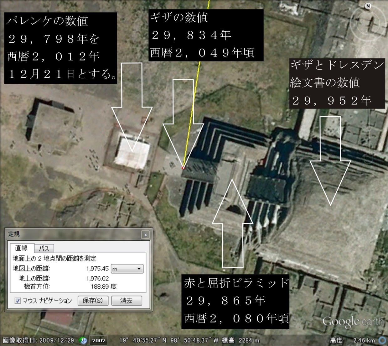 ここまで見てきたように、画面の白く塗られた祭壇の中央の位置を、マヤの暦の終わりと言われる西暦2,012年12月21日と見ると、その他の位置はエジプトのピラミッドの告げる時期と誤差の範囲で一致を見せることになります。