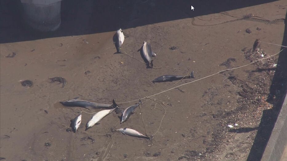 イルカ9頭打ち上げられる、8頭が死ぬ 静岡の河口近く