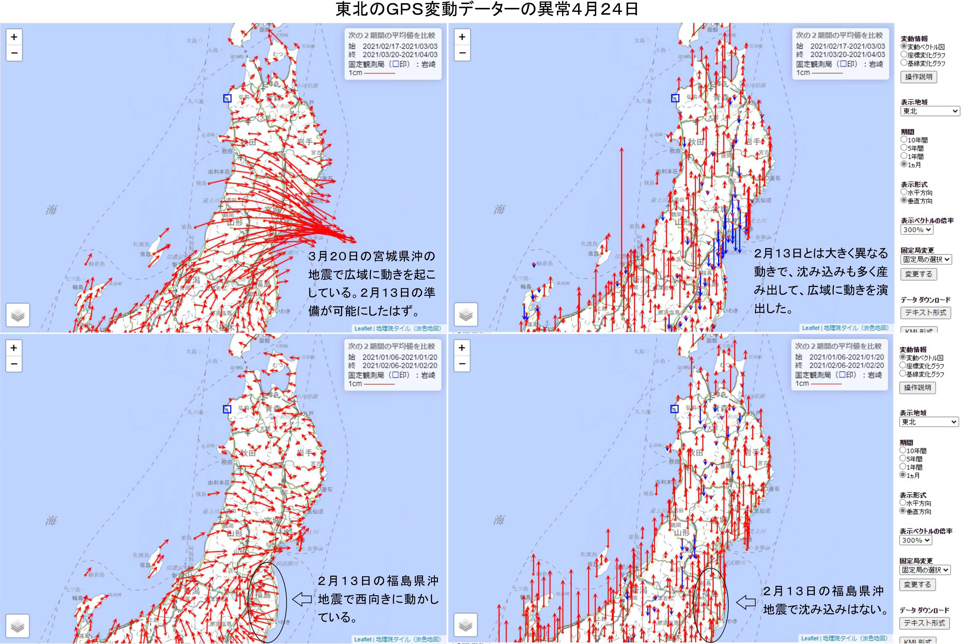 イラストに東北のGPS変動データーの異常を載せます。311地震の直後のように、宮城県沖に向かうGPS変動データーが明確に出されており、3月20日の宮城県沖の地震の誘発した動きが顕在化していました。