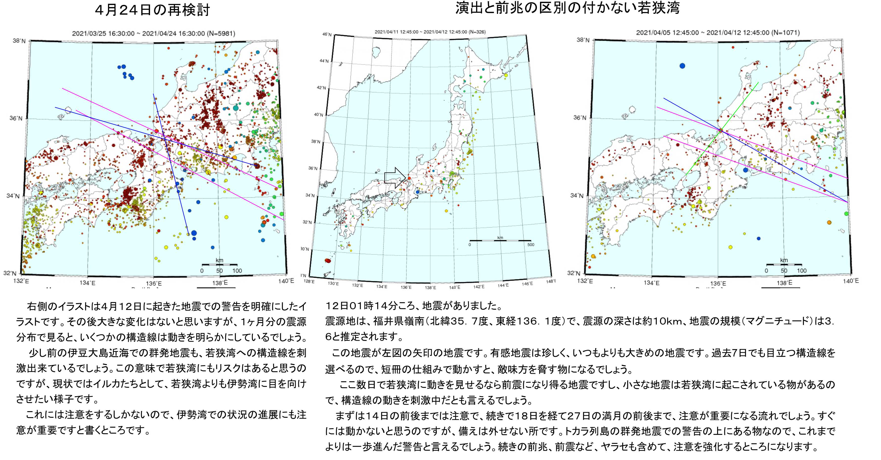 右側のイラストは4月12日に起きた地震での警告を明確にしたイラストです。その後大きな変化はないと思いますが、1ヶ月分の震源分布で見ると、いくつかの構造線は動きを明らかにしているでしょう。