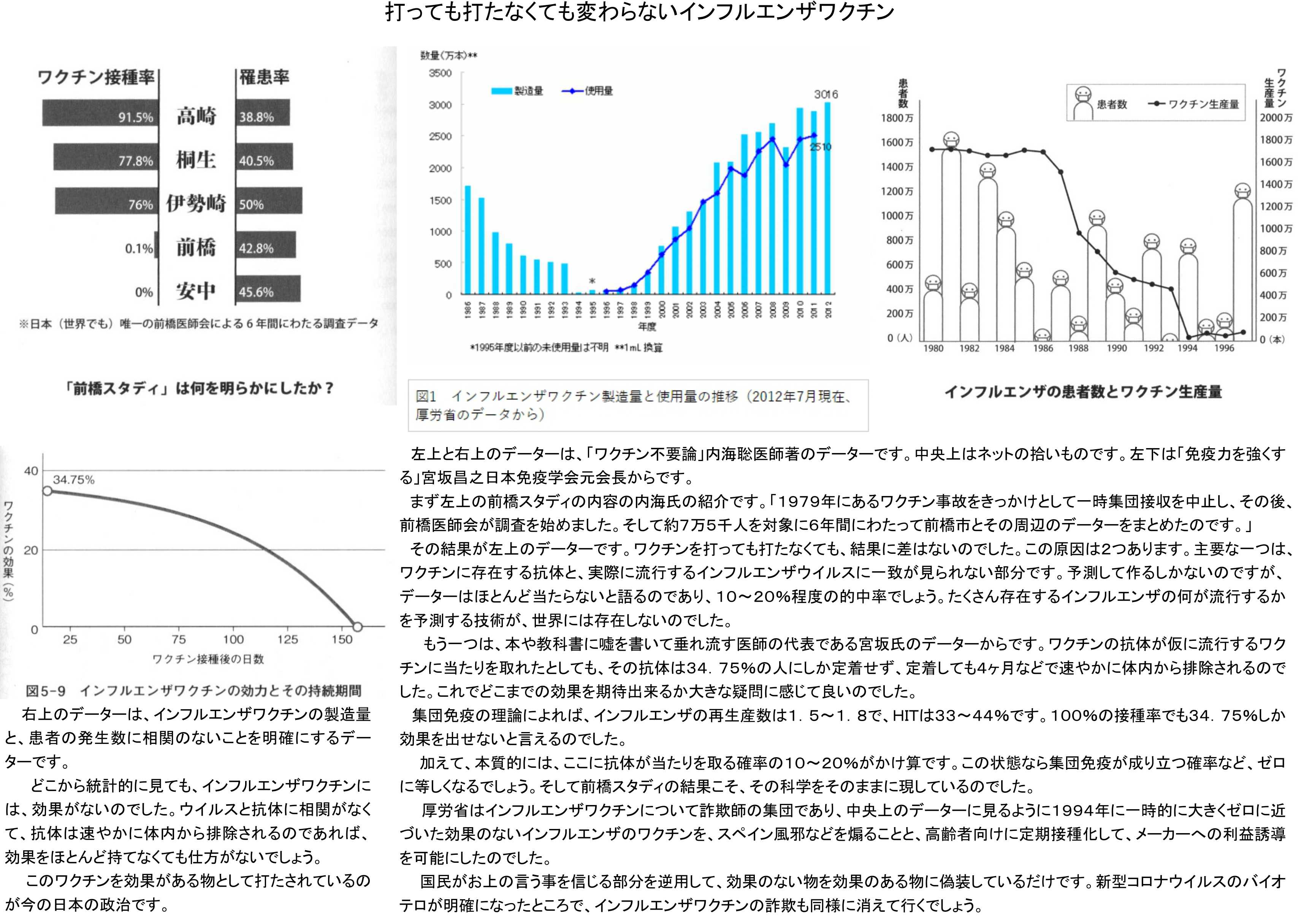 イラストの右上のデーターは、インフルエンザワクチンの製造量と、患者の発生数に相関のないことを明確にするデーターです。