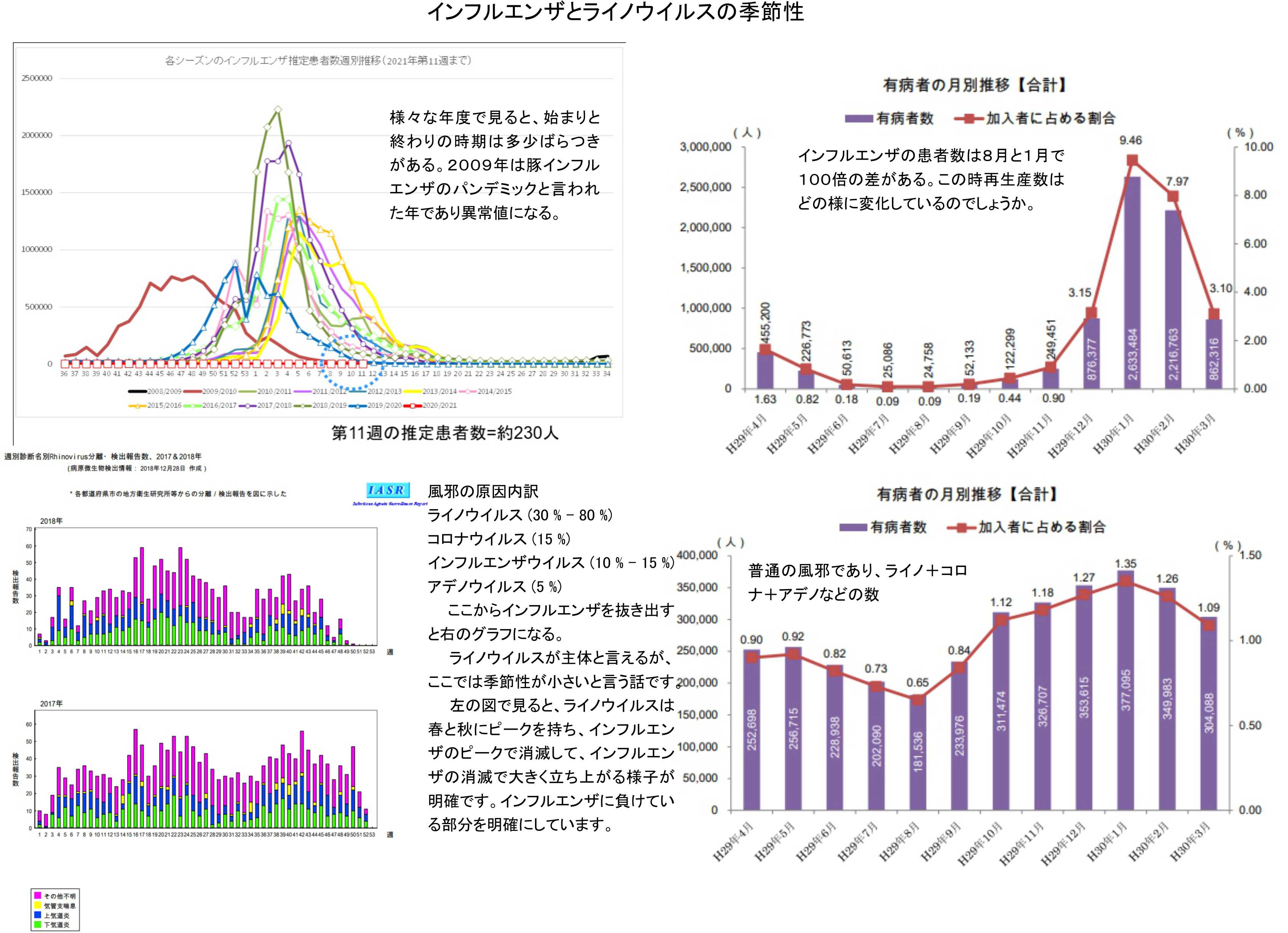 イラストの左の図で見ると、ライノウイルスは春と秋にピークを持ち、インフルエンザのピークで消滅して、インフルエンザの消滅で大きく立ち上がる様子が明確です。インフルエンザに負けている部分を明確にしています。