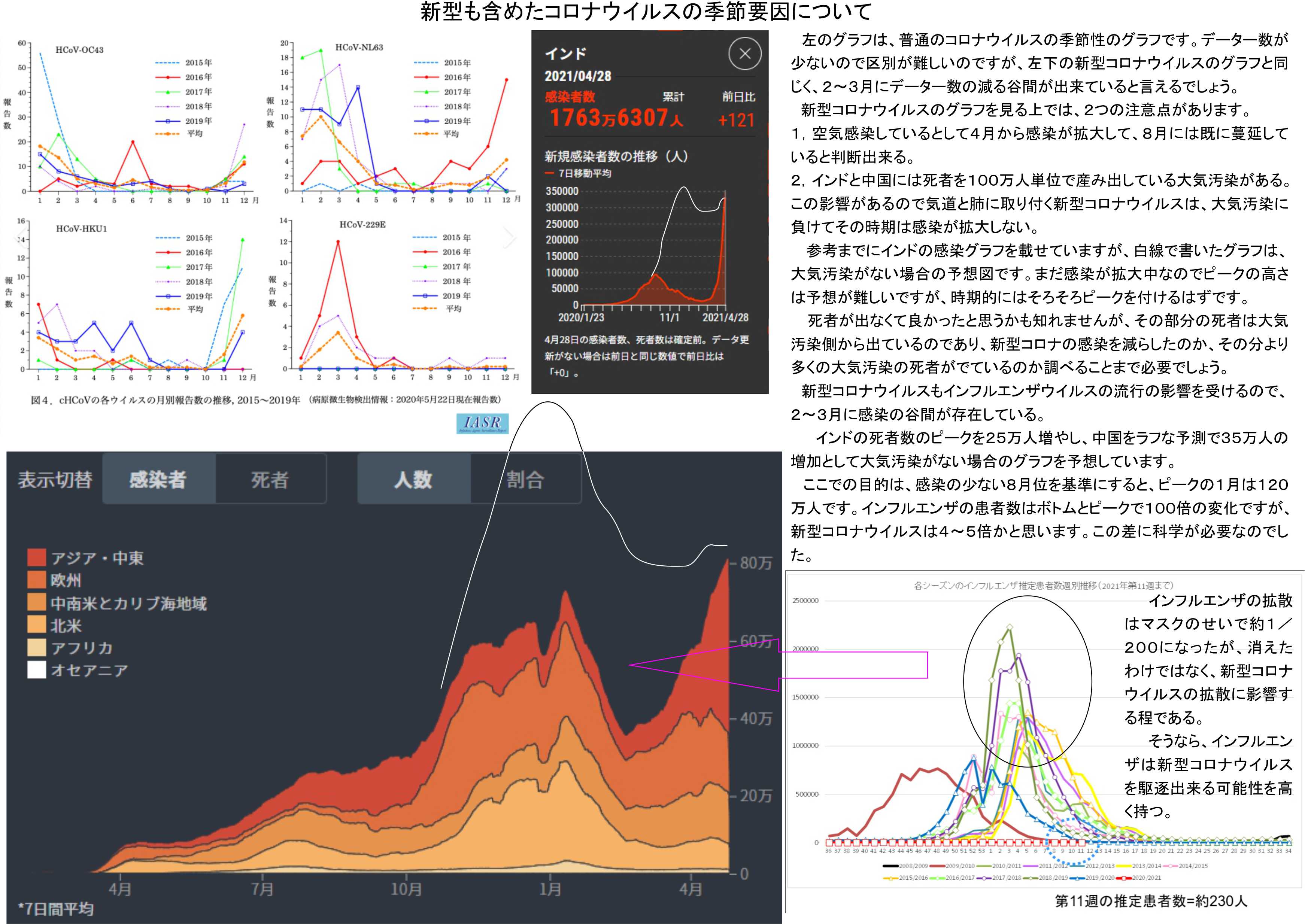 b)新型コロナウイルスも、普通のコロナウイルスも、2~3月の時期にインフルエンザの影響を受けやすく、インフルエンザに負ける時期がある。