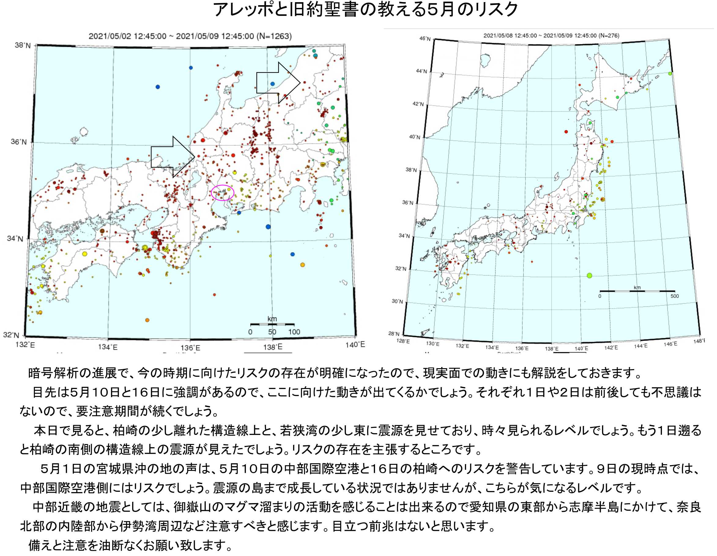 5月1日の宮城県沖の地の声は、5月10日の中部国際空港と16日の柏崎へのリスクを警告しています。9日の現時点では、中部国際空港側にはリスクでしょう。震源の島まで成長している状況ではありませんが、こちらが気になるレベルです。