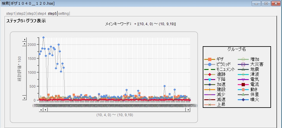 作業はまだ途中なのですが、ギザをGZ、ナイルをnileで調べたところ、ギザでは(10,4,0)でピラミッドが強調されていることが分かりました。下のグラフがそのデーターです。5,200年の中で、この部分のみブルーのピラミッドの数値が前から約20年間分10倍近く高くなっています。