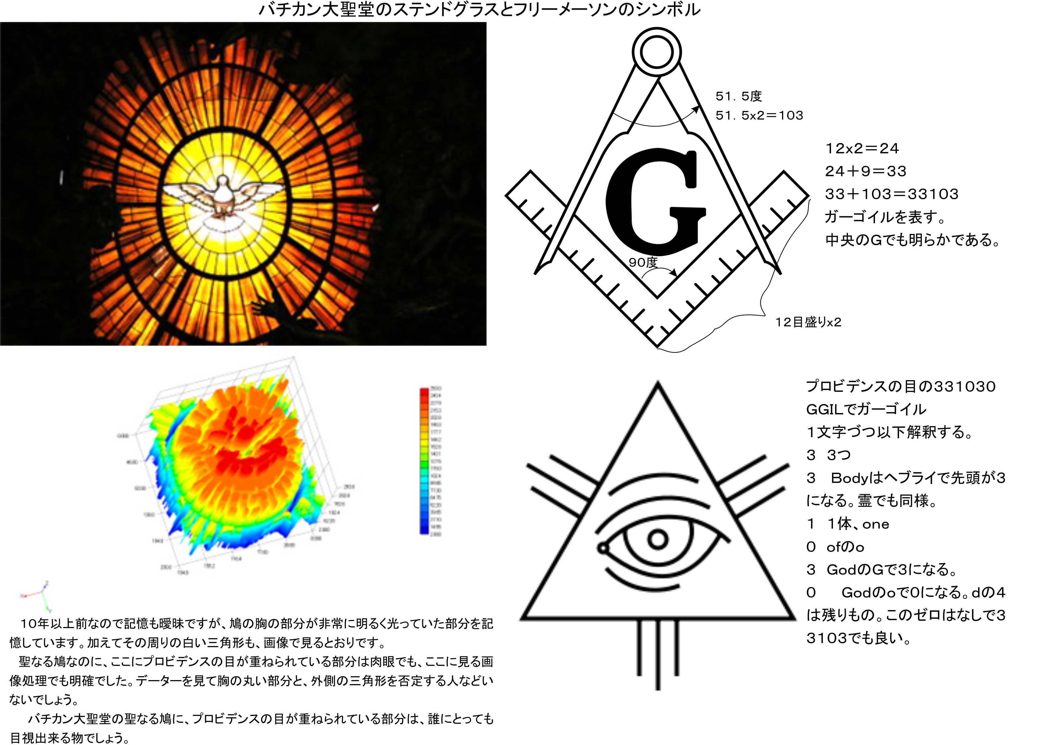 どうしてこれが必要なのか、ず~と分からずにいました。三位一体の中身が分からないのでこのステンドグラスの意味が正確には理解出来ていなかったのです。当時のこの本で、暗号解析の結果でプロビデンスの目であり、フリーメーソンと関係があるとまでを知る事が出来ていたのでした。