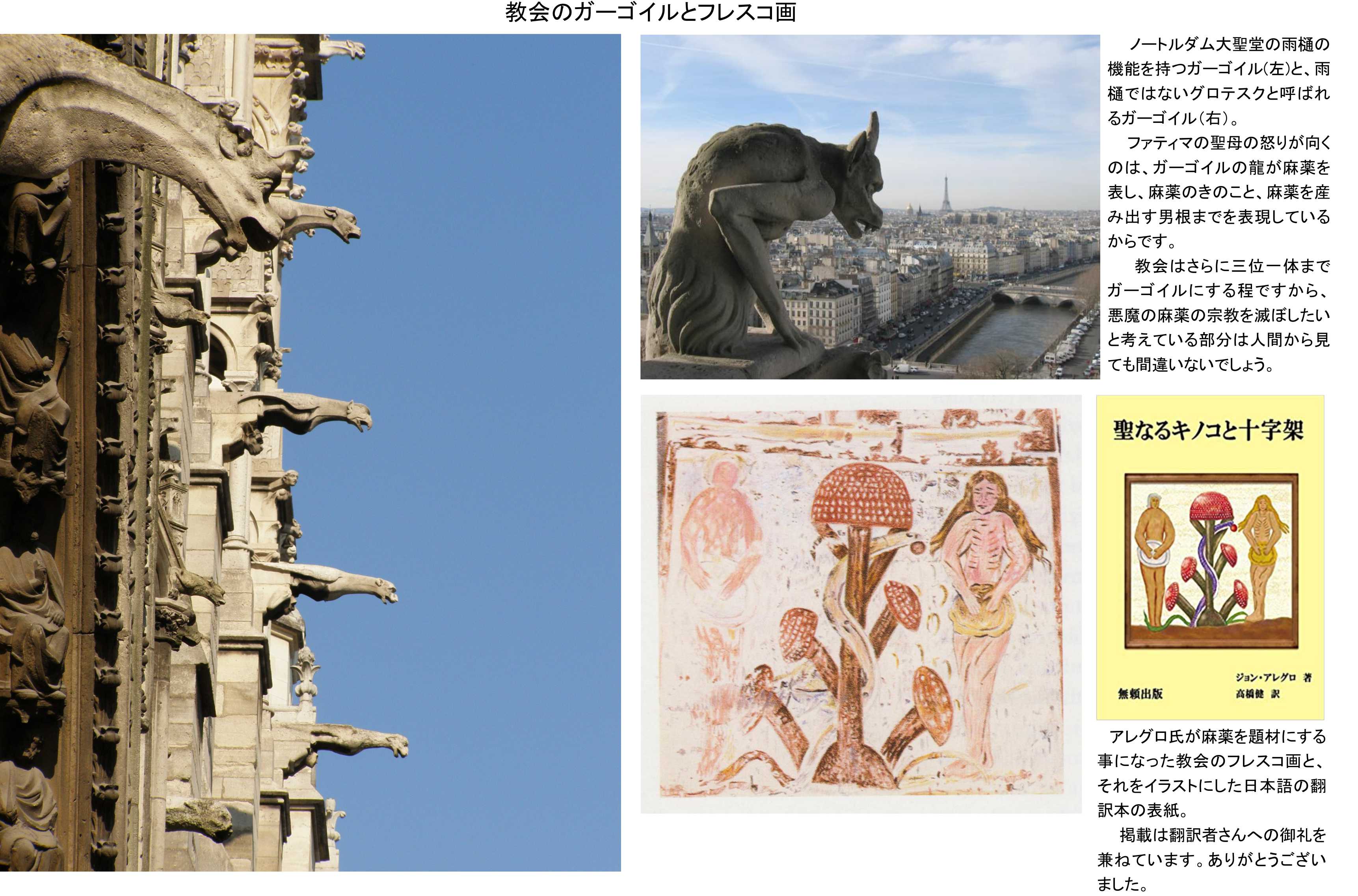 しかしながら言語学としての麻薬の影響を評価した部分は、そのままに今でも使えます。ファティマの聖母の怒りの炎がノートルダム大聖堂に向いたのは、ここにたくさん備え付けられているガーゴイルが、麻薬を現す竜であり、きのこでもあって男根でもあるからです。人類への愛を語る聖母が麻薬まみれにされるので怒るのでした。