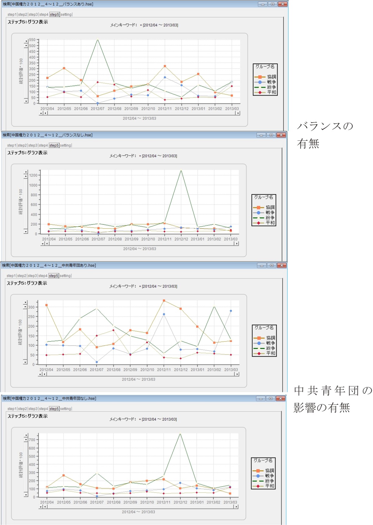 グラフを見てゆく条件を、バランスがある場合とない場合、あと、胡錦涛一派の名前である中共青年団の影響のある場合とない場合で分けてみました。
