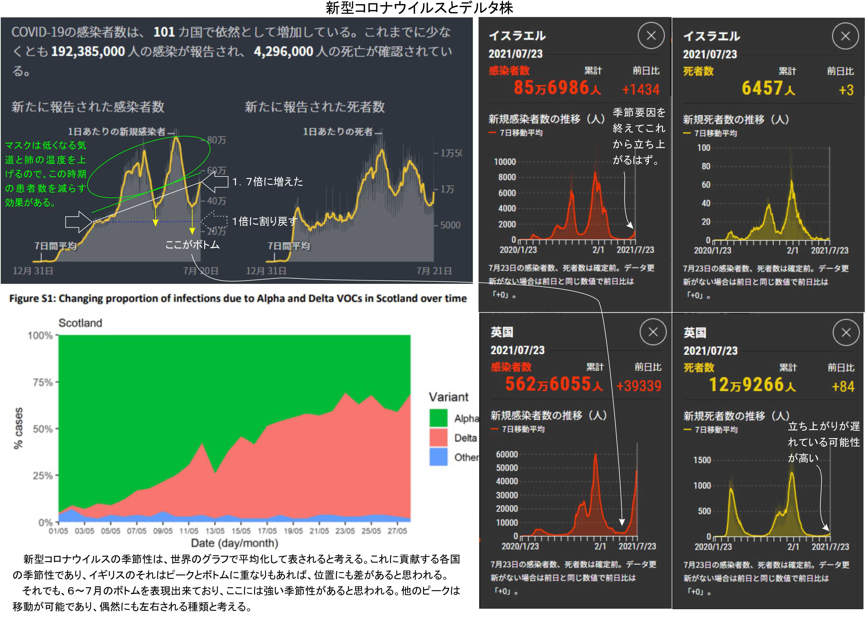 季節要因を世界で見る為には、昨年7月から平均的に時系列で1.7倍に成長した姿を割り戻せば参考になるでしょう。その結果で分かるのは6~8月くらいにウイルス活動の底が来ると言う事です。各国の事情で前後もするでしょうが、イギリスもイスラエルもこの時期を選ばされたことになるのでしょう。