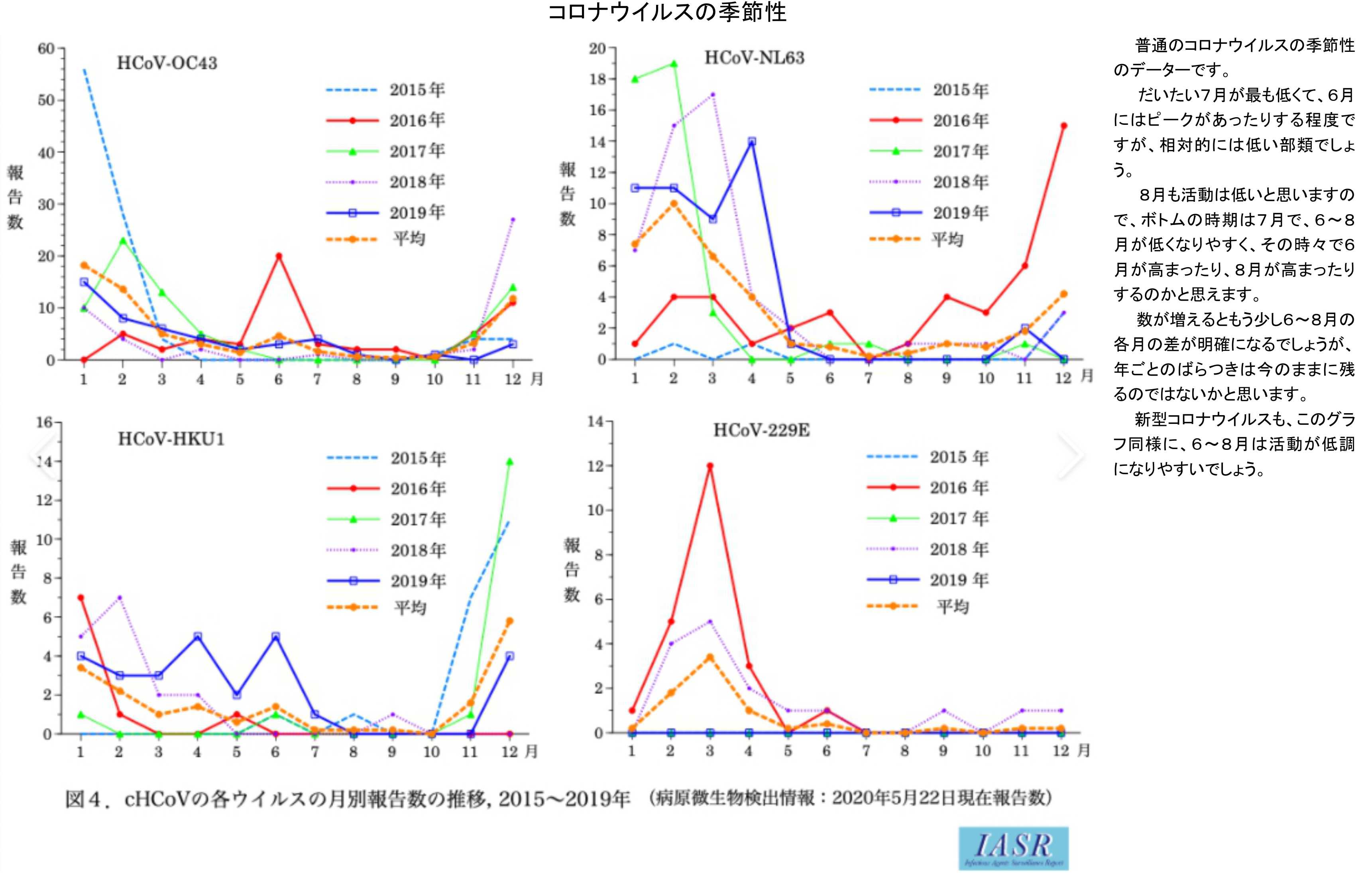 2)新型コロナウイルスの季節要因には、コロナウイルスのデーターを添付します。別種の物ですが、複数の種類を重ねてみると、6~8月くらいの活動の底が見られる。