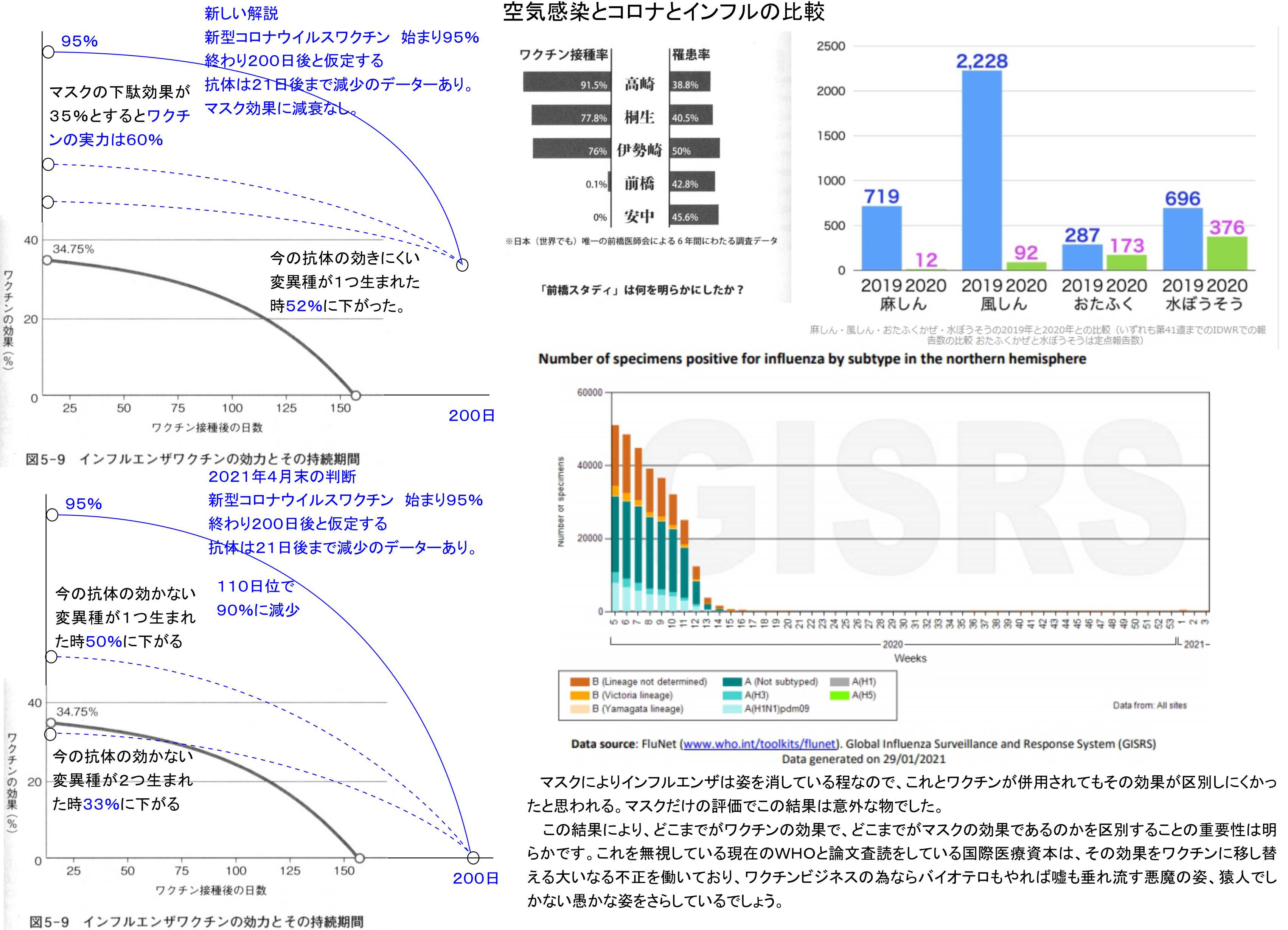 インフルエンザのワクチンが、患者数を抑制出来なかったデーターと、マスクがインフルエンザを抑制したデーターをイラストに載せます。ワクチンがなくてもインフルエンザはマスクで防げるでしょうし、ワクチンではインフルエンザの拡散など防げないのでした。これで34%の効果があるワクチンと考えて下さい。