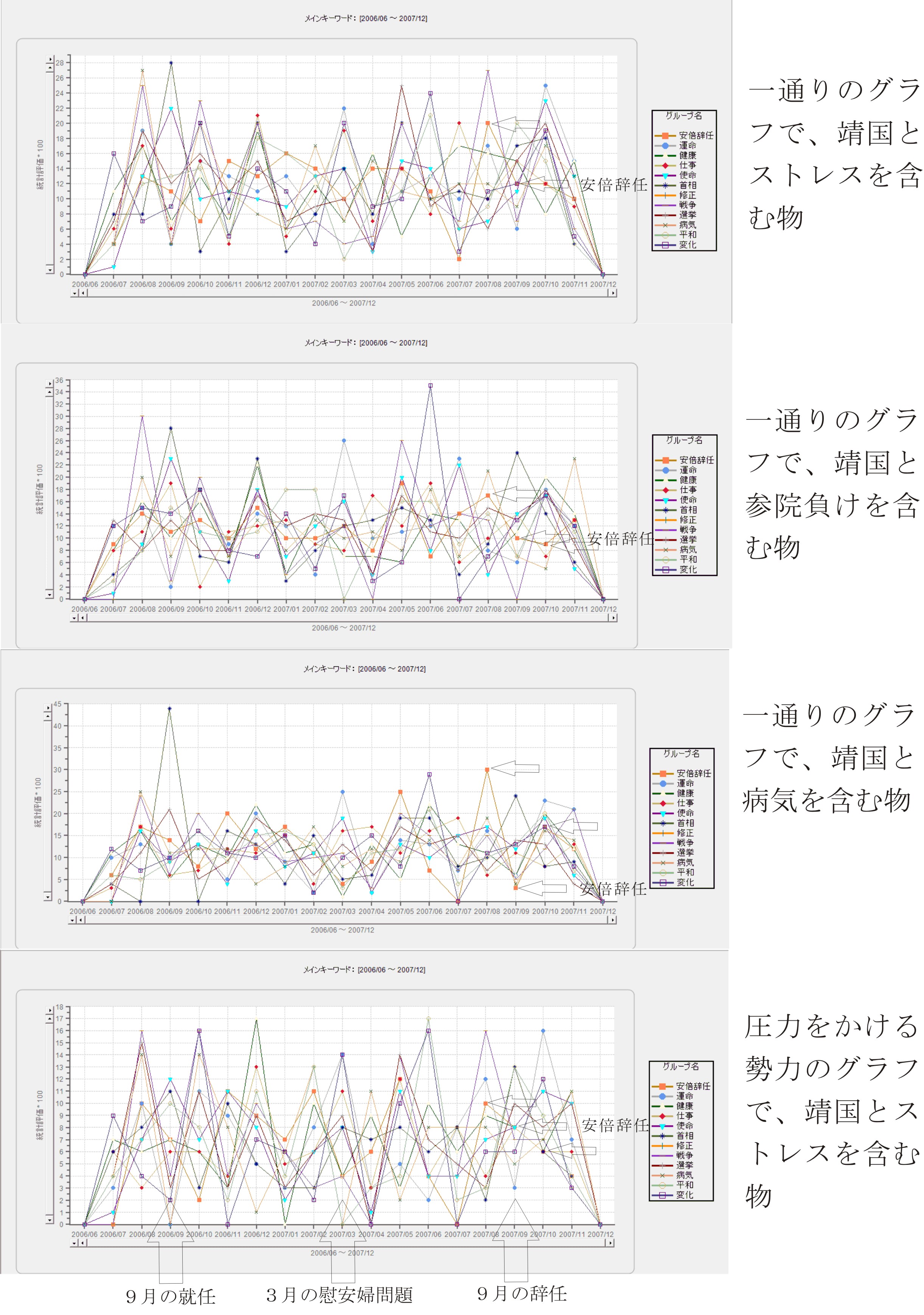 こちらの解析としては、まだまだ分からないこともあります。2,006年9月に首相というグラフのピークがあるのは首相就任だと思えるのですが、2,007年9月のピークが辞任だと判断するのはまだ難しいです。