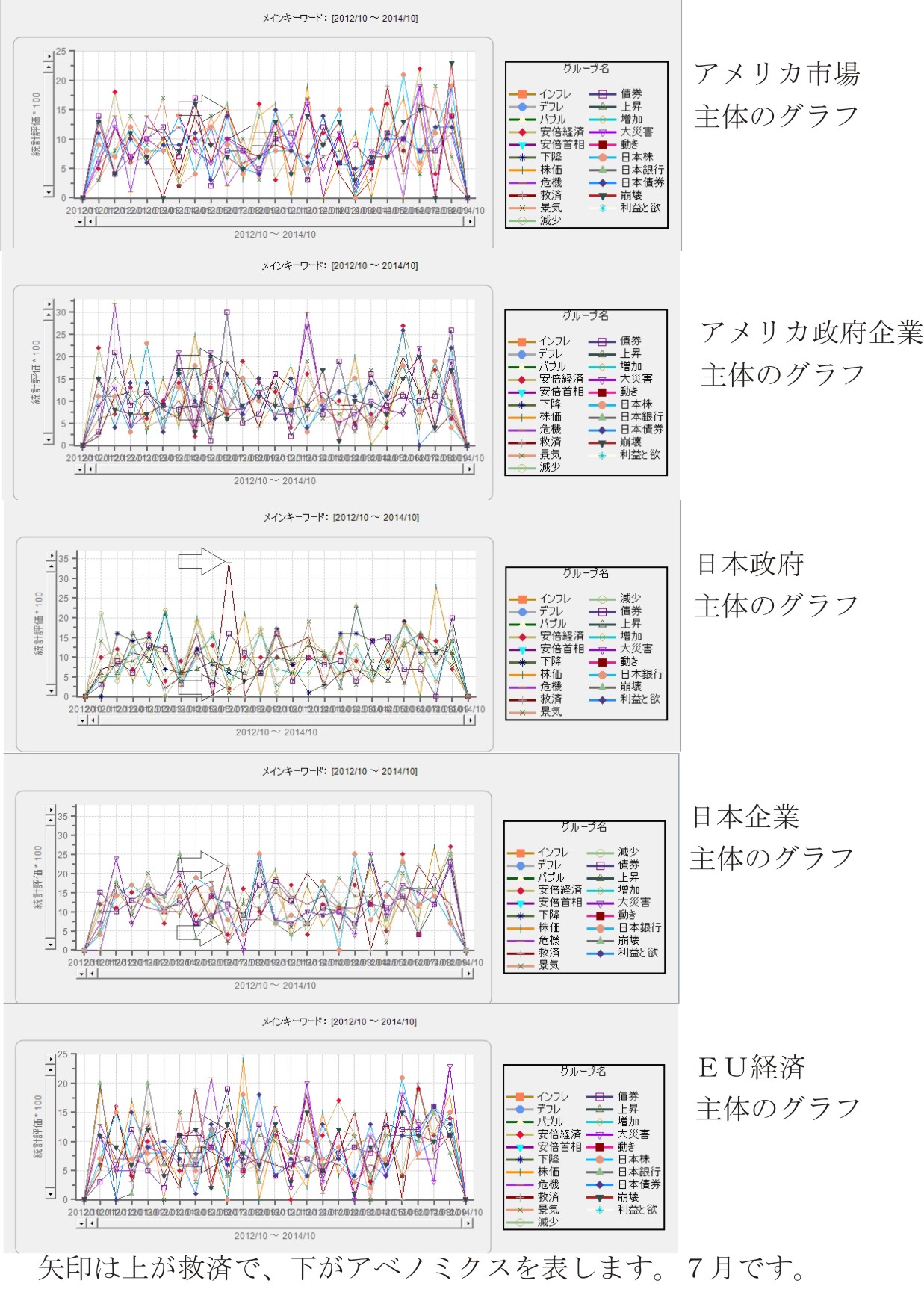 アメリカ政治の動向、経済の動向、EUの経済の動向、日本の政治、経済の動向の5つをそれぞれ複数のグラフから評価し、最後にこの5つの結果を主に見て考えた物が以下の公表結果です。これ以外にも安倍政権や尖閣の衝突についても調べています。