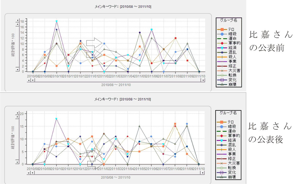 2つめのグラフは、北朝鮮の砲撃という1つめのグラフの条件に加えて、比嘉さんの公表という条件も加えた物です。その結果はこの2つの数値が双方とも低下するのでした。テロも暗殺も明らかに数値が下がり、テロは数値がゼロにまで下がってしまっています。