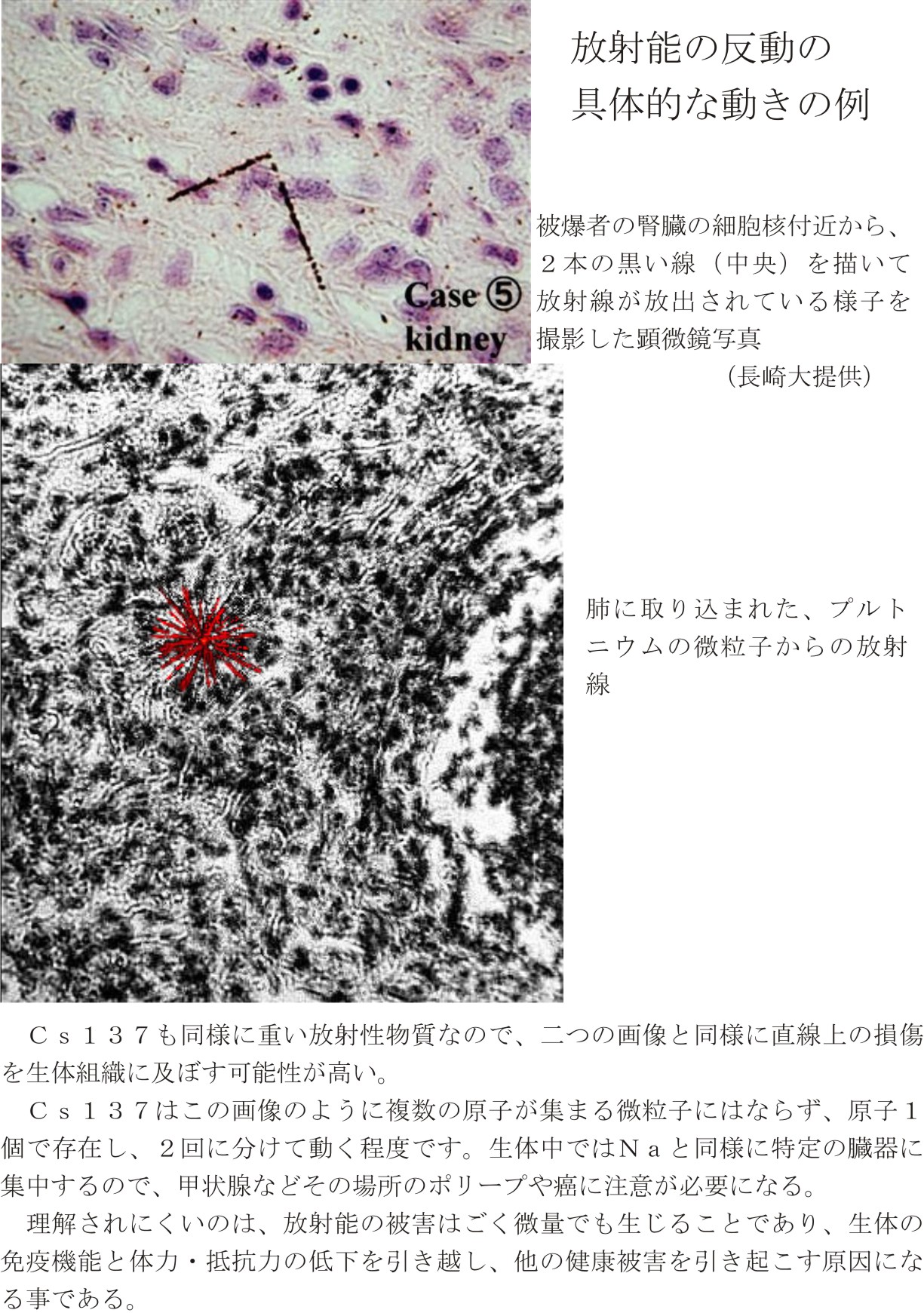 直線的に伸びる放射線の動きの経路は、この経路を作り出した物質が重くてH2Oや炭素をはじき飛ばしていることを表しているのです。そしてこれは放射性セシウムCs137でも同様に起きる事であり、その蓄積部位の生体組織を破壊しているのです。