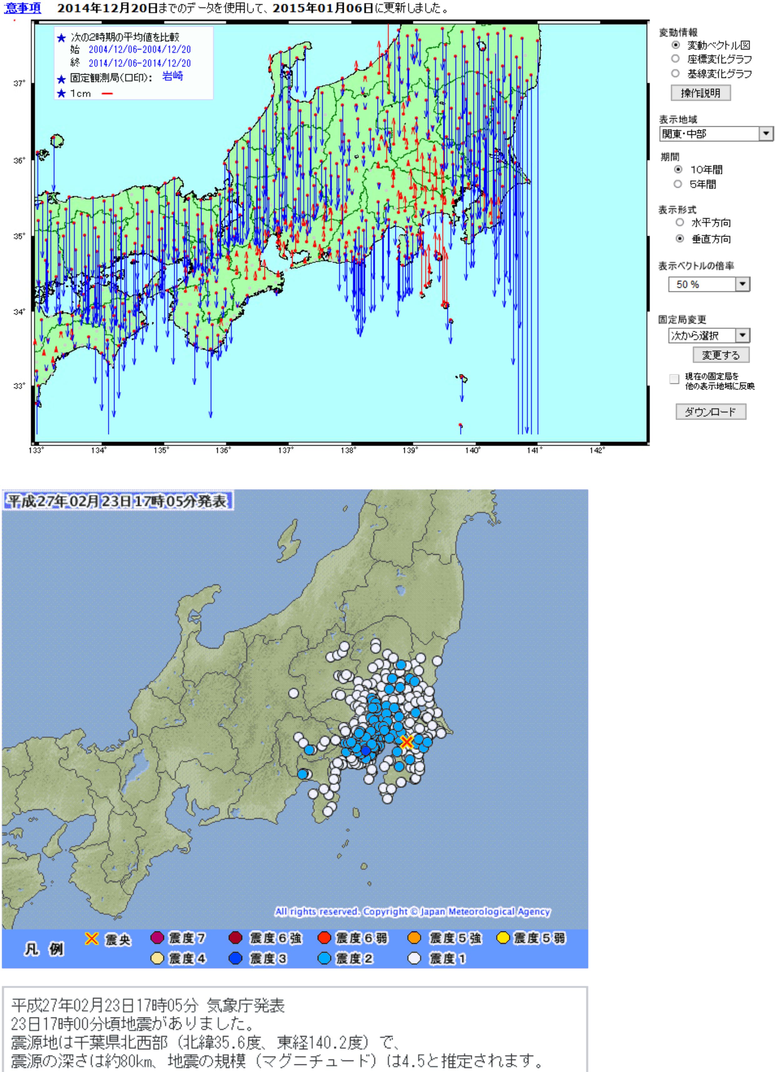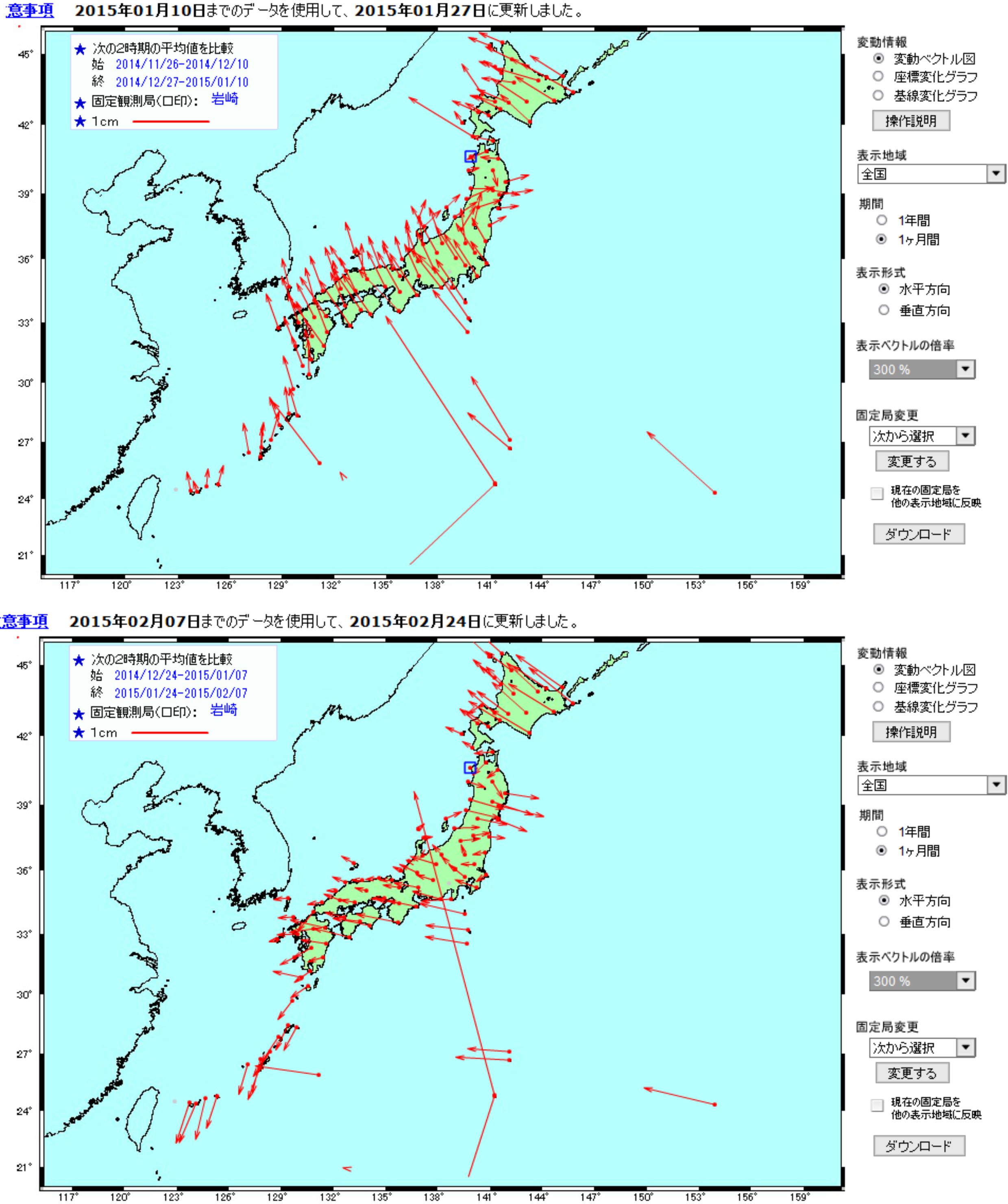 本日発表のGPSの地殻の動きのデーターを見ていると、関連する変化が起きているのか明確ではありませんが、日本全体で変化の見られる状況です。