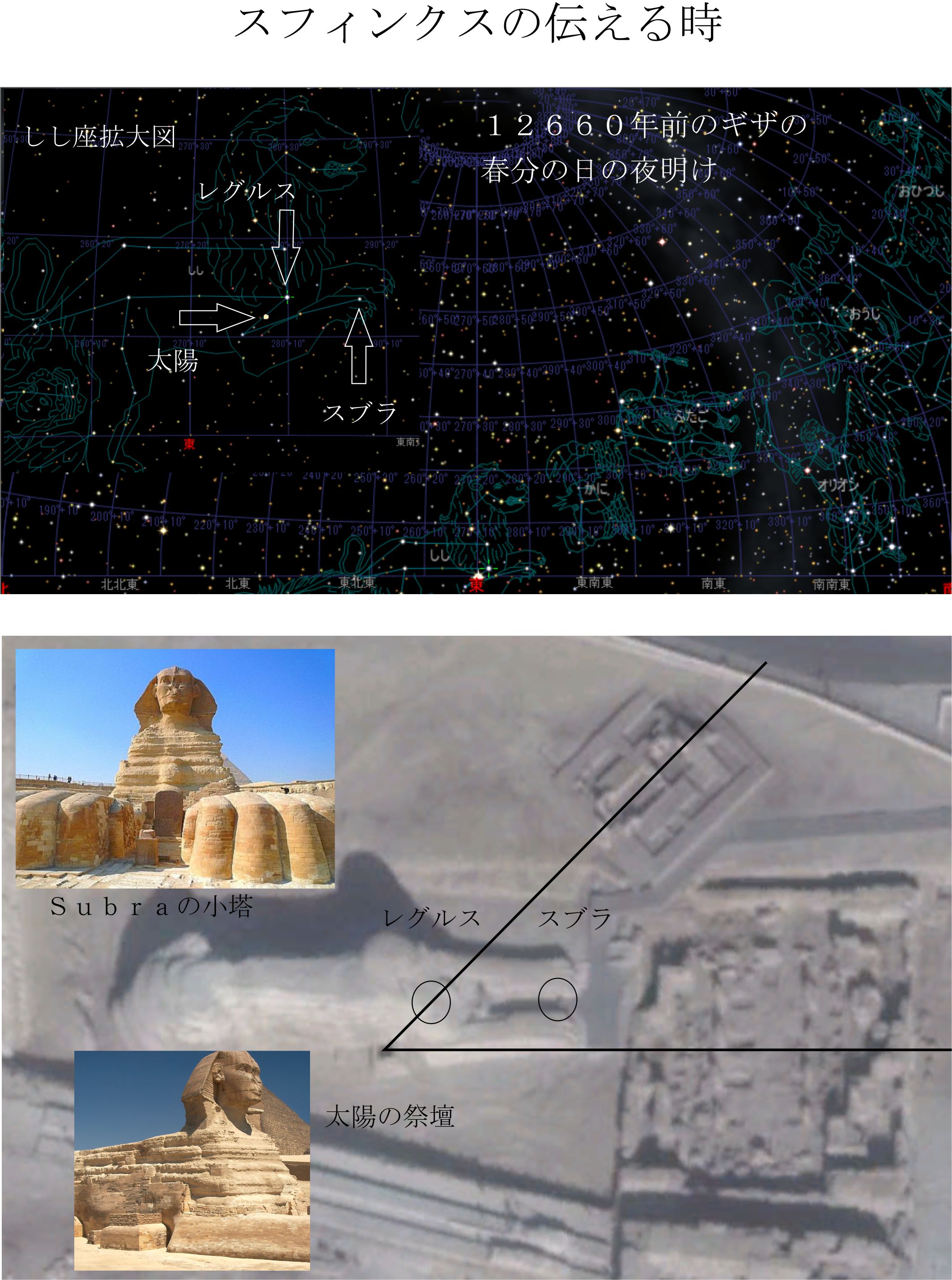 12660年前の春分の夜明けには、しし座のレグルスの少し下側に太陽が位置して真東からの日の出を迎えます。図から分かるように、Subraとレグルスの距離の半分くらいの距離関係の位置に太陽があるのです。