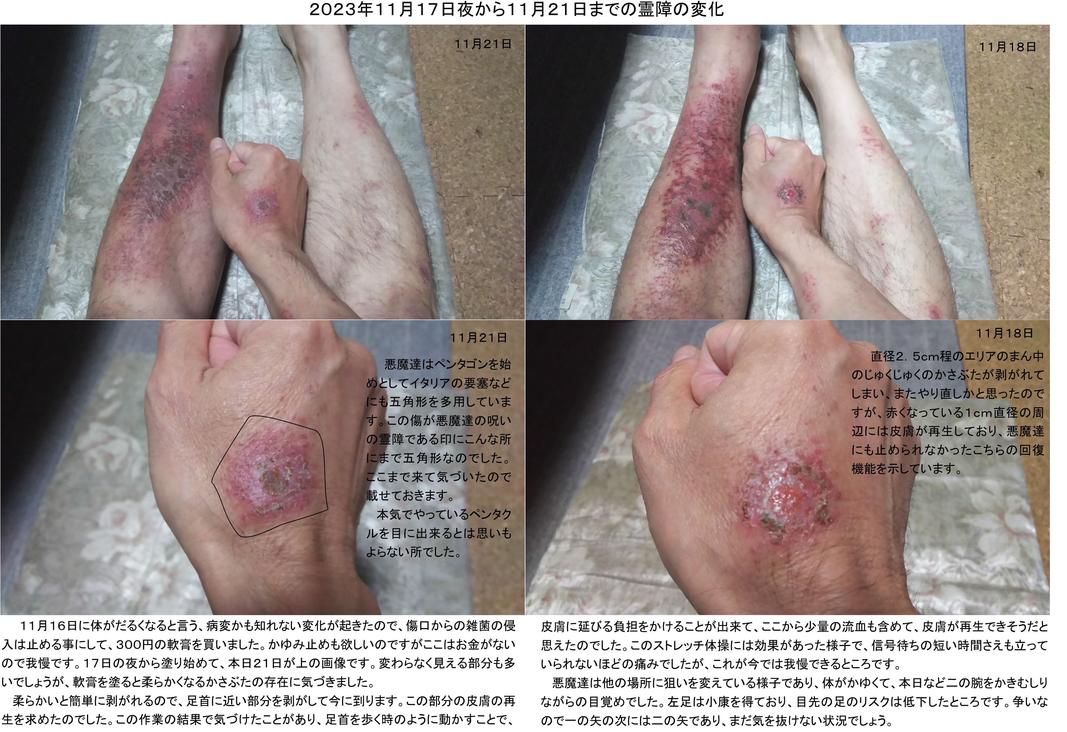 2年前のイスラエルのガザ侵攻に合わせてひどくなった霊障です。この前の半年ほどは治らない1cmくらいの傷という感じでしたが、ここから一気に広がって左足のすねの内側をボロボロにしていました。始まりは放置で直したかったのですが、立っていられないところまで痛みが増したので、そこからは医学の知識を使って治療です。痛みは解決できましたが治らないのでした。1年ほどは左足のすね部分を湯船につけられなくて、苦しい思いをしてきたのでした。
